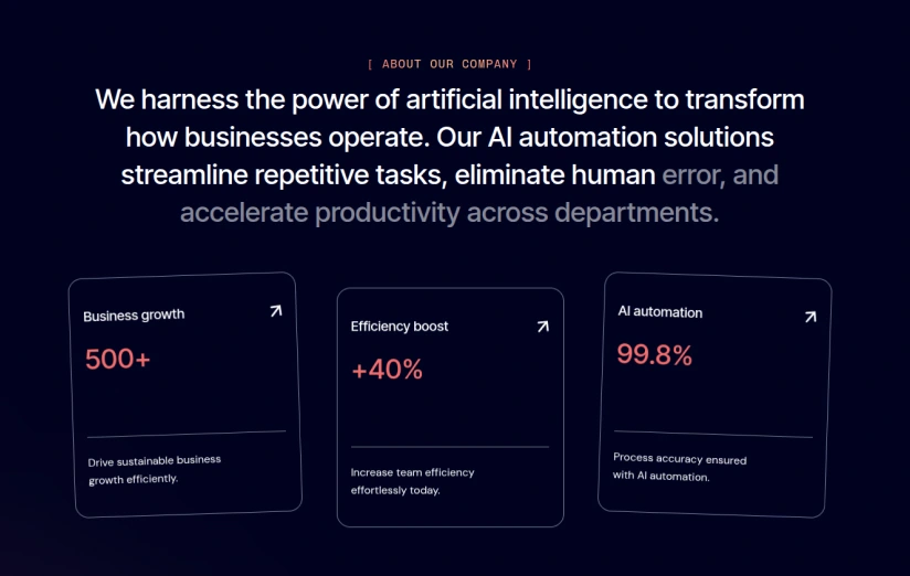 {"type":"@webflow/XscpData","payload":{"nodes":[{"_id":"cac0f537-c0cd-5939-d77e-788234466cd9","type":"Section","tag":"section","classes":["cf5ead73-0592-683b-42cf-fb452ebd6356","94e55140-7324-e78a-460b-8394393fa924"],"children":["474d7e0e-f767-7fde-c33b-a9c04fba7c7f"],"data":{"tag":"section","devlink":{"runtimeProps":{},"slot":""},"displayName":"","attr":{"id":""},"xattr":[],"search":{"exclude":false},"visibility":{"conditions":[]},"grid":{"type":"section"}}},{"_id":"474d7e0e-f767-7fde-c33b-a9c04fba7c7f","type":"BlockContainer","tag":"div","classes":["2e21e857-9682-1d02-6e8d-096fe4dc7f2c"],"children":["8ecd3081-c3f3-8fef-4d7d-7329e015305a"],"data":{"tag":"div","devlink":{"runtimeProps":{},"slot":""},"displayName":"","attr":{"id":""},"xattr":[],"search":{"exclude":false},"visibility":{"conditions":[]},"grid":{"type":"container"}}},{"_id":"8ecd3081-c3f3-8fef-4d7d-7329e015305a","type":"Block","tag":"div","classes":["cf5ead73-0592-683b-42cf-fb452ebd6359","cf5ead73-0592-683b-42cf-fb452ebd6360"],"children":["f32d1fee-409c-32a6-6855-1e26f890282d","788b6109-49d7-5415-bd94-5ff159ef5436"],"data":{"text":false,"tag":"div","devlink":{"runtimeProps":{},"slot":""},"displayName":"","attr":{"id":""},"xattr":[],"search":{"exclude":false},"visibility":{"conditions":[]}}},{"_id":"f32d1fee-409c-32a6-6855-1e26f890282d","type":"VFlex","tag":"div","classes":["cf5ead73-0592-683b-42cf-fb452ebd6354","dd033788-117b-59fb-3029-57ca44bdb9a6"],"children":["b77ae28d-46b9-da77-ddf2-b4ceb9a799f6","28151d9d-bbe8-dd3f-580a-a20f43d46c68"],"data":{"tag":"div","devlink":{"runtimeProps":{},"slot":""},"displayName":"","attr":{"id":""},"xattr":[],"search":{"exclude":false},"visibility":{"conditions":[]}}},{"_id":"b77ae28d-46b9-da77-ddf2-b4ceb9a799f6","type":"Block","tag":"div","classes":["2e21e857-9682-1d02-6e8d-096fe4dc7f24","796356de-664e-7d08-7fff-212ed24315b0","796356de-664e-7d08-7fff-212ed24315ca"],"children":["b8af7807-f25f-f7a9-8b58-c7e2e95e6df6"],"data":{"text":true,"tag":"div","devlink":{"runtimeProps":{},"slot":""},"displayName":"","attr":{"id":""},"xattr":[],"search":{"exclude":false},"visibility":{"conditions":[]}}},{"_id":"b8af7807-f25f-f7a9-8b58-c7e2e95e6df6","text":true,"v":"[ About our company ]"},{"_id":"28151d9d-bbe8-dd3f-580a-a20f43d46c68","type":"Block","tag":"div","classes":["796356de-664e-7d08-7fff-212ed24315a0","cf5ead73-0592-683b-42cf-fb452ebd6361"],"children":["3f4c3cc7-0c2b-7c00-2831-8a3f7c30b28e"],"data":{"text":false,"tag":"div","devlink":{"runtimeProps":{},"slot":""},"displayName":"","attr":{"id":""},"xattr":[],"search":{"exclude":false},"visibility":{"conditions":[]}}},{"_id":"3f4c3cc7-0c2b-7c00-2831-8a3f7c30b28e","type":"Block","tag":"div","classes":["2e21e857-9682-1d02-6e8d-096fe4dc7f2a"],"children":["b5a961d6-1c0a-e0cb-68f1-0fd865b6a970","faa12953-09e5-b587-e410-0236c6daf9f7"],"data":{"text":false,"tag":"div","devlink":{"runtimeProps":{},"slot":""},"displayName":"","attr":{"id":""},"xattr":[],"search":{"exclude":false},"visibility":{"conditions":[]}}},{"_id":"b5a961d6-1c0a-e0cb-68f1-0fd865b6a970","type":"Block","tag":"div","classes":["2e21e857-9682-1d02-6e8d-096fe4dc7f2b"],"children":["cc9e40bd-8ba0-4b67-0e10-a2090acacda3"],"data":{"text":false,"tag":"div","devlink":{"runtimeProps":{},"slot":""},"displayName":"","attr":{"id":""},"xattr":[],"search":{"exclude":false},"visibility":{"conditions":[]}}},{"_id":"cc9e40bd-8ba0-4b67-0e10-a2090acacda3","type":"Block","tag":"div","classes":["2e21e857-9682-1d02-6e8d-096fe4dc7f20","00678abb-51a5-ea8f-010e-35c40bcda1c8"],"children":["83eb748d-f9bf-02ae-bf31-a48a89596916"],"data":{"text":true,"tag":"div","devlink":{"runtimeProps":{},"slot":""},"displayName":"","attr":{"id":""},"xattr":[],"search":{"exclude":false},"visibility":{"conditions":[]}}},{"_id":"83eb748d-f9bf-02ae-bf31-a48a89596916","text":true,"v":"We harness the power of artificial intelligence to transform how businesses operate. Our AI automation solutions streamline repetitive tasks, eliminate human error, and accelerate productivity across departments."},{"_id":"faa12953-09e5-b587-e410-0236c6daf9f7","type":"Block","tag":"div","classes":["796356de-664e-7d08-7fff-212ed243159e","796356de-664e-7d08-7fff-212ed24315c2"],"children":["13891af3-cc72-e4f8-3d85-37ab95de5f58","f869f711-7419-73d5-4d73-ec73299eb1a5","3e7f0dc8-4e79-40c9-3092-e4f1ebb46ecd","d58cf0d0-9171-9293-cf00-bc3db196887b"],"data":{"text":false,"tag":"div","devlink":{"runtimeProps":{},"slot":""},"displayName":"","attr":{"id":""},"xattr":[],"search":{"exclude":false},"visibility":{"conditions":[]}}},{"_id":"13891af3-cc72-e4f8-3d85-37ab95de5f58","type":"Block","tag":"div","classes":["2e21e857-9682-1d02-6e8d-096fe4dc7f2a","7590a11e-70d5-3363-7f41-ad356be7ea55","da83cde3-cc66-cec3-ab5a-88640d11f4e5"],"children":["d7f70ba9-a6b8-eac2-b571-8fcdcee4a248"],"data":{"text":false,"tag":"div","devlink":{"runtimeProps":{},"slot":""},"displayName":"","attr":{"id":""},"xattr":[],"search":{"exclude":false},"visibility":{"conditions":[]}}},{"_id":"d7f70ba9-a6b8-eac2-b571-8fcdcee4a248","type":"Block","tag":"div","classes":["796356de-664e-7d08-7fff-212ed243159e","796356de-664e-7d08-7fff-212ed24315bf","796356de-664e-7d08-7fff-212ed24315cd"],"children":[],"data":{"text":false,"tag":"div","devlink":{"runtimeProps":{},"slot":""},"displayName":"","attr":{"id":""},"xattr":[],"search":{"exclude":false},"visibility":{"conditions":[]}}},{"_id":"f869f711-7419-73d5-4d73-ec73299eb1a5","type":"Block","tag":"div","classes":["2e21e857-9682-1d02-6e8d-096fe4dc7f2a","7590a11e-70d5-3363-7f41-ad356be7ea55","9c237a5a-29a9-f000-7441-6c2f6fa9d9db"],"children":["0033930b-49dc-4d6c-93fc-bca36d42c9e1"],"data":{"text":false,"tag":"div","devlink":{"runtimeProps":{},"slot":""},"displayName":"","attr":{"id":""},"xattr":[],"search":{"exclude":false},"visibility":{"conditions":[]}}},{"_id":"0033930b-49dc-4d6c-93fc-bca36d42c9e1","type":"Block","tag":"div","classes":["796356de-664e-7d08-7fff-212ed243159e","796356de-664e-7d08-7fff-212ed24315bf","796356de-664e-7d08-7fff-212ed24315c5"],"children