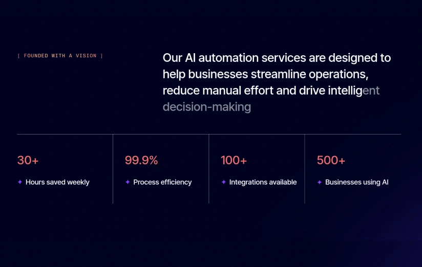 {"type":"@webflow/XscpData","payload":{"nodes":[{"_id":"cf92f56f-b15e-282a-9318-8b17f4b12995","type":"Section","tag":"section","classes":["e90ffe2f-58a0-ae4e-63c9-018101d29e04","e90ffe2f-58a0-ae4e-63c9-018101d29e06"],"children":["20633af3-f5d5-6f59-9946-0ecb1ea3404a","cd6b0d9c-8cab-ad14-9df8-4930d34d5f6d"],"data":{"tag":"section","devlink":{"runtimeProps":{},"slot":""},"displayName":"","attr":{"id":""},"xattr":[],"search":{"exclude":false},"visibility":{"conditions":[]},"grid":{"type":"section"}}},{"_id":"20633af3-f5d5-6f59-9946-0ecb1ea3404a","type":"BlockContainer","tag":"div","classes":["2e21e857-9682-1d02-6e8d-096fe4dc7f2c"],"children":["bd968f24-a619-d579-e7be-2650f91e9480","add12d4c-402f-90d1-4512-8e79bcec4580"],"data":{"tag":"div","devlink":{"runtimeProps":{},"slot":""},"displayName":"","attr":{"id":""},"xattr":[],"search":{"exclude":false},"visibility":{"conditions":[]},"grid":{"type":"container"}}},{"_id":"bd968f24-a619-d579-e7be-2650f91e9480","type":"Block","tag":"div","classes":["7ca5a842-6534-0851-0c5f-d1cbe2513e79","e90ffe2f-58a0-ae4e-63c9-018101d29e07","e90ffe2f-58a0-ae4e-63c9-018101d29e0b"],"children":["c29ae571-2085-8693-16b9-dc7b6c2b6e9d"],"data":{"text":false,"tag":"div","devlink":{"runtimeProps":{},"slot":""},"displayName":"","attr":{"id":""},"xattr":[],"search":{"exclude":false},"visibility":{"conditions":[]}}},{"_id":"c29ae571-2085-8693-16b9-dc7b6c2b6e9d","type":"HFlex","tag":"div","classes":["7ca5a842-6534-0851-0c5f-d1cbe2513e75"],"children":["8005446e-4cdd-a565-7e77-5981235279a4","670f15d2-ec17-646c-799c-41c8f8581411"],"data":{"tag":"div","devlink":{"runtimeProps":{},"slot":""},"displayName":"","attr":{"id":""},"xattr":[],"search":{"exclude":false},"visibility":{"conditions":[]}}},{"_id":"8005446e-4cdd-a565-7e77-5981235279a4","type":"Block","tag":"div","classes":["7ca5a842-6534-0851-0c5f-d1cbe2513e7a"],"children":["90097a17-731e-8cfe-4998-d57ba1edae96"],"data":{"text":false,"tag":"div","devlink":{"runtimeProps":{},"slot":""},"displayName":"","attr":{"id":""},"xattr":[],"search":{"exclude":false},"visibility":{"conditions":[]}}},{"_id":"90097a17-731e-8cfe-4998-d57ba1edae96","type":"Block","tag":"div","classes":["2e21e857-9682-1d02-6e8d-096fe4dc7f24","796356de-664e-7d08-7fff-212ed24315b0","796356de-664e-7d08-7fff-212ed24315ca"],"children":["a82b5269-5d9f-0a66-d1d1-fab043572d0c"],"data":{"text":true,"tag":"div","devlink":{"runtimeProps":{},"slot":""},"displayName":"","attr":{"id":""},"xattr":[],"search":{"exclude":false},"visibility":{"conditions":[]}}},{"_id":"a82b5269-5d9f-0a66-d1d1-fab043572d0c","text":true,"v":"[ Founded with a vision ]"},{"_id":"670f15d2-ec17-646c-799c-41c8f8581411","type":"Block","tag":"div","classes":["796356de-664e-7d08-7fff-212ed24315a0","cf5ead73-0592-683b-42cf-fb452ebd6361","2376f8c7-8e9c-b090-a236-d3ed1421462d"],"children":["ca2cbfb4-ffb3-dbb8-30c1-bb11ab8f0036"],"data":{"text":false,"tag":"div","devlink":{"runtimeProps":{},"slot":""},"displayName":"","attr":{"id":""},"xattr":[],"search":{"exclude":false},"visibility":{"conditions":[]}}},{"_id":"ca2cbfb4-ffb3-dbb8-30c1-bb11ab8f0036","type":"Block","tag":"div","classes":["2e21e857-9682-1d02-6e8d-096fe4dc7f2a"],"children":["daa2fd1d-2d2f-e830-7277-734d30c44e53","175792f2-42a4-6139-0b6a-5d82da4fc329"],"data":{"text":false,"tag":"div","devlink":{"runtimeProps":{},"slot":""},"displayName":"","attr":{"id":""},"xattr":[],"search":{"exclude":false},"visibility":{"conditions":[]}}},{"_id":"daa2fd1d-2d2f-e830-7277-734d30c44e53","type":"Block","tag":"div","classes":["2e21e857-9682-1d02-6e8d-096fe4dc7f1f"],"children":["552d755a-1312-8d8e-3741-00c46051fcda"],"data":{"text":false,"tag":"div","devlink":{"runtimeProps":{},"slot":""},"displayName":"","attr":{"id":""},"xattr":[],"search":{"exclude":false},"visibility":{"conditions":[]}}},{"_id":"552d755a-1312-8d8e-3741-00c46051fcda","type":"Block","tag":"div","classes":["2e21e857-9682-1d02-6e8d-096fe4dc7f20","00678abb-51a5-ea8f-010e-35c40bcda1c8","743deafb-cabe-2b96-97b3-cb4f76524164"],"children":["effb9dde-d903-bb92-b627-389b86b1c676"],"data":{"text":true,"tag":"div","devlink":{"runtimeProps":{},"slot":""},"displayName":"","attr":{"id":""},"xattr":[],"search":{"exclude":false},"visibility":{"conditions":[]}}},{"_id":"effb9dde-d903-bb92-b627-389b86b1c676","text":true,"v":"Our AI automation services are designed to help businesses streamline operations, reduce manual effort and drive intelligent decision-making"},{"_id":"175792f2-42a4-6139-0b6a-5d82da4fc329","type":"Block","tag":"div","classes":["796356de-664e-7d08-7fff-212ed243159e","796356de-664e-7d08-7fff-212ed24315c2"],"children":["f05bb249-e361-989f-b0e8-480ffe45e599","3aa0df28-d6f5-4906-7627-390a15b87864","f7ead9ec-46be-93e5-558e-307d566b803a","50bc954f-beb4-f5f5-c77b-5de68aa69528"],"data":{"text":false,"tag":"div","devlink":{"runtimeProps":{},"slot":""},"displayName":"","attr":{"id":""},"xattr":[],"search":{"exclude":false},"visibility":{"conditions":[]}}},{"_id":"f05bb249-e361-989f-b0e8-480ffe45e599","type":"Block","tag":"div","classes":["2e21e857-9682-1d02-6e8d-096fe4dc7f2a","7590a11e-70d5-3363-7f41-ad356be7ea55","da83cde3-cc66-cec3-ab5a-88640d11f4e5"],"children":["38af72ed-4ac9-9042-a3e9-c09c26b11052"],"data":{"text":false,"tag":"div","devlink":{"runtimeProps":{},"slot":""},"displayName":"","attr":{"id":""},"xattr":[],"search":{"exclude":false},"visibility":{"conditions":[]}}},{"_id":"38af72ed-4ac9-9042-a3e9-c09c26b11052","type":"Block","tag":"div","classes":["796356de-664e-7d08-7fff-212ed243159e","796356de-664e-7d08-7fff-212ed24315bf","796356de-664e-7d08-7fff-212ed24315cd"],"children":[],"data":{"text":false,"tag":"div","devlink":{"runtimeProps":{},"slot":""},"displayName":"","attr":{"id":""},"xattr":[],"search":{"exclude":false},"visibility":{"conditions":[]}}},{"_id":"3aa0df28-d6f5-4906-7627-390a15b87864","type":"Block","tag":"div","classes":["2e21e857-9682-1d02-6e8d-096fe4dc7f2a","7590a11e-70d5-3363-7f41-ad356be7ea55","9c237a5a-29a9-f000-7441-6c2f6fa9d9db"],"children":["75fd9e33-1c81-69e2-2aa9-5