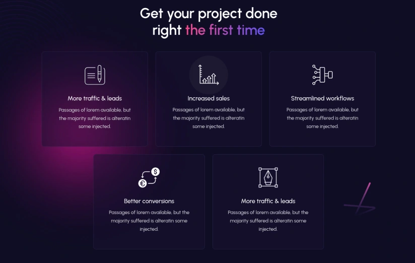 {"type":"@webflow/XscpData","payload":{"nodes":[{"_id":"99fee256-c0eb-8a4b-44a9-a329a5929b3b","type":"Section","tag":"section","classes":["89754a78-1c01-7738-4c4d-edc972f07ffc"],"children":["689a16b6-7a71-58f1-4d83-097de8e7c8ac"],"data":{"tag":"section","devlink":{"runtimeProps":{},"slot":""},"displayName":"","attr":{"id":""},"xattr":[],"search":{"exclude":false},"visibility":{"conditions":[]},"grid":{"type":"section"}}},{"_id":"689a16b6-7a71-58f1-4d83-097de8e7c8ac","type":"Container","tag":"div","classes":["c1402dc8-bb48-0f57-1e99-175e46ae1aff"],"children":["96336884-bf0a-3b1f-c882-5ef6739dfbff"],"data":{"tag":"div","devlink":{"runtimeProps":{},"slot":""},"displayName":"","attr":{"id":""},"xattr":[],"search":{"exclude":false},"visibility":{"conditions":[]},"grid":{"type":"container"}}},{"_id":"96336884-bf0a-3b1f-c882-5ef6739dfbff","type":"Block","tag":"div","classes":["7b590c3f-9556-1a75-c22e-0a87b6dd0f49","89754a78-1c01-7738-4c4d-edc972f08005"],"children":["17edb07c-974b-6d05-09f8-a2b61ad717a9","2241c9a6-3cb8-2aa5-873b-63b85d012c91","87e410c7-f887-5bee-14e4-86e5b7368fc2"],"data":{"text":false,"tag":"div","devlink":{"runtimeProps":{},"slot":""},"displayName":"","attr":{"id":""},"xattr":[],"search":{"exclude":false},"visibility":{"conditions":[]}}},{"_id":"17edb07c-974b-6d05-09f8-a2b61ad717a9","type":"Block","tag":"div","classes":["be6c8882-da69-3d54-9715-5127c8ec933b","431a48f9-5b72-54e6-b225-86b6b0986760","77d4066c-528a-708a-aba1-bd3bc0b65990","71606695-36ff-6218-b839-afefe974d2f5"],"children":["13c106c0-5aa6-9af9-9a6e-824bee4bd938"],"data":{"text":false,"tag":"div","devlink":{"runtimeProps":{},"slot":""},"displayName":"","attr":{"id":""},"xattr":[],"search":{"exclude":false},"visibility":{"conditions":[]}}},{"_id":"13c106c0-5aa6-9af9-9a6e-824bee4bd938","type":"Heading","tag":"h2","classes":["152d7d26-245f-b055-a4a9-209310118e7b"],"children":["88828906-9f2b-742e-e47f-417d458e978f","ac7747a1-a508-2170-1c0f-190e7200989e"],"data":{"tag":"h2","devlink":{"runtimeProps":{},"slot":""},"displayName":"","attr":{"id":""},"xattr":[],"search":{"exclude":false},"visibility":{"conditions":[]}}},{"_id":"88828906-9f2b-742e-e47f-417d458e978f","text":true,"v":"Get your project done right "},{"_id":"ac7747a1-a508-2170-1c0f-190e7200989e","type":"Span","tag":"span","classes":["df5d7df7-0388-9b76-3f90-affc7b47276f"],"children":["9d3a88c7-4376-40c7-57a2-9e0f4f43d5cb"],"data":{"devlink":{"runtimeProps":{},"slot":""},"displayName":"","attr":{"id":""},"xattr":[],"search":{"exclude":false},"visibility":{"conditions":[]}}},{"_id":"9d3a88c7-4376-40c7-57a2-9e0f4f43d5cb","text":true,"v":"the first time"},{"_id":"2241c9a6-3cb8-2aa5-873b-63b85d012c91","type":"Block","tag":"div","classes":["89754a78-1c01-7738-4c4d-edc972f07ff9"],"children":["b5b0a1e1-7814-2008-5fb9-6149903ec1d8","1eee7d16-780e-b2a6-7d76-7adf61550622","ffaec40b-871b-8cc0-5716-9eb29ac6d89e"],"data":{"text":false,"tag":"div","devlink":{"runtimeProps":{},"slot":""},"displayName":"","attr":{"id":""},"xattr":[],"search":{"exclude":false},"visibility":{"conditions":[]}}},{"_id":"b5b0a1e1-7814-2008-5fb9-6149903ec1d8","type":"Block","tag":"div","classes":["89754a78-1c01-7738-4c4d-edc972f07fff","89754a78-1c01-7738-4c4d-edc972f08006"],"children":["4dfeb316-d727-bfc3-6f33-f527cb6a8856","c09c984a-a2cf-dfac-6d10-dac1be2555ed","6cb10a42-554d-88a4-d3bc-dbf71e2aee0d"],"data":{"text":false,"tag":"div","devlink":{"runtimeProps":{},"slot":""},"displayName":"","attr":{"id":""},"xattr":[],"search":{"exclude":false},"visibility":{"conditions":[]}}},{"_id":"4dfeb316-d727-bfc3-6f33-f527cb6a8856","type":"Block","tag":"div","classes":["89754a78-1c01-7738-4c4d-edc972f07ffa","89754a78-1c01-7738-4c4d-edc972f08000"],"children":["51129770-c09e-8673-4637-8901998b8344","ae35cefc-79ca-a3bc-2cee-f5a8ed657fa4"],"data":{"text":false,"tag":"div","devlink":{"runtimeProps":{},"slot":""},"displayName":"","attr":{"id":""},"xattr":[],"search":{"exclude":false},"visibility":{"conditions":[]}}},{"_id":"51129770-c09e-8673-4637-8901998b8344","type":"Block","tag":"div","classes":["89754a78-1c01-7738-4c4d-edc972f07ffb","89754a78-1c01-7738-4c4d-edc972f08007"],"children":[],"data":{"text":false,"tag":"div","devlink":{"runtimeProps":{},"slot":""},"displayName":"","attr":{"id":""},"xattr":[],"search":{"exclude":false},"visibility":{"conditions":[]}}},{"_id":"ae35cefc-79ca-a3bc-2cee-f5a8ed657fa4","type":"Image","tag":"img","classes":["89754a78-1c01-7738-4c4d-edc972f07ffd"],"children":[],"data":{"img":{"id":"6715e12a25bd313f89bdc9b9"},"srcsetDisabled":false,"attr":{"width":"80","height":"79","alt":"__wf_reserved_inherit","src":"https://cdn.prod.website-files.com/6715e12a25bd313f89bdc946/6715e12a25bd313f89bdc9b9_more%20traffic%20icons%20two.svg","loading":"auto","id":""},"sizes":[],"devlink":{"runtimeProps":{},"slot":""},"displayName":"","xattr":[],"search":{"exclude":false},"visibility":{"conditions":[]}}},{"_id":"c09c984a-a2cf-dfac-6d10-dac1be2555ed","type":"Block","tag":"div","classes":["7b590c3f-9556-1a75-c22e-0a87b6dd0f45","7b590c3f-9556-1a75-c22e-0a87b6dd0f56"],"children":["4e6576f8-2efa-23a5-c57d-feab51179898"],"data":{"text":true,"tag":"div","devlink":{"runtimeProps":{},"slot":""},"displayName":"","attr":{"id":""},"xattr":[],"search":{"exclude":false},"visibility":{"conditions":[]}}},{"_id":"4e6576f8-2efa-23a5-c57d-feab51179898","text":true,"v":"More traffic & leads"},{"_id":"6cb10a42-554d-88a4-d3bc-dbf71e2aee0d","type":"Paragraph","tag":"p","classes":[],"children":["fb38971d-63b4-9c1f-a014-87a2ce8a3dcc"],"data":{"devlink":{"runtimeProps":{},"slot":""},"displayName":"","attr":{"id":""},"xattr":[],"search":{"exclude":false},"visibility":{"conditions":[]}}},{"_id":"fb38971d-63b4-9c1f-a014-87a2ce8a3dcc","text":true,"v":"Passages of lorem available, but the majority suffered is alteratin some injected."},{"_id":"1eee7d16-780e-b2a6-7d76-7adf61550622","type":"Block","tag":"div","classes":["89754a78-1c01-7738-4c4d-edc972f07fff","89754a78-1c01-7738-4c4d-edc972f08006"],"children":["27259afc-7fbb-4aa7-28ab-f5c
