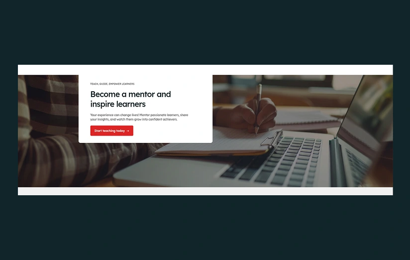 {"type":"@webflow/XscpData","payload":{"nodes":[{"_id":"0510188a-07cf-e568-a381-37b70107e874","type":"Section","tag":"section","classes":["6e1988bd-1cd3-fc58-45b7-3cede9840e0b","4bec7fcc-81f8-f5a0-b7cc-ff4704e61437","06807c78-f6a8-5e49-b04e-2b3a9a932bd9"],"children":["0056de62-95eb-831b-0adb-5f8be94ccfe8","e788f1f8-29a3-b15b-ab02-3c165bd5c04e","36ecf2b9-b7bc-bd85-920c-9cde8090ac7e"],"data":{"tag":"section","devlink":{"runtimeProps":{},"slot":""},"displayName":"","attr":{"id":""},"xattr":[],"search":{"exclude":false},"visibility":{"conditions":[]},"grid":{"type":"section"}}},{"_id":"0056de62-95eb-831b-0adb-5f8be94ccfe8","type":"BlockContainer","tag":"div","classes":["b9a22c5b-1b52-8771-01ab-e615aaa514bd"],"children":["6fc6f871-353d-c62a-4e23-498c7ed98401"],"data":{"tag":"div","devlink":{"runtimeProps":{},"slot":""},"displayName":"","attr":{"id":""},"xattr":[],"search":{"exclude":false},"visibility":{"conditions":[]},"grid":{"type":"container"}}},{"_id":"6fc6f871-353d-c62a-4e23-498c7ed98401","type":"Block","tag":"div","classes":["789ecd7e-a138-3d2c-e4f1-ac210d8937c0"],"children":["d6f31eaf-db5a-ed34-6b72-d7fc1e9fec3b","627e149d-9b0b-b781-3f95-313c74559fad","1f645039-2512-5e9f-f842-140c6e2b0308","17c50e80-41d7-d1b9-bad2-db869bd92b10"],"data":{"text":false,"tag":"div","devlink":{"runtimeProps":{},"slot":""},"displayName":"","attr":{"id":""},"xattr":[],"search":{"exclude":false},"visibility":{"conditions":[]}}},{"_id":"d6f31eaf-db5a-ed34-6b72-d7fc1e9fec3b","type":"Block","tag":"div","classes":["a14e10e0-01b2-63cb-4dba-2a5ff6e0ac84","72ef8218-a30a-d2bc-f2bd-25f2c0de4ad4"],"children":["739c0ebe-fdad-c8dc-365b-57d2c0e67ebe"],"data":{"text":true,"tag":"div","devlink":{"runtimeProps":{},"slot":""},"displayName":"","attr":{"id":""},"xattr":[],"search":{"exclude":false},"visibility":{"conditions":[]}}},{"_id":"739c0ebe-fdad-c8dc-365b-57d2c0e67ebe","text":true,"v":"TEACH, GUIDE, EMPOWER LEARNERS"},{"_id":"627e149d-9b0b-b781-3f95-313c74559fad","type":"Heading","tag":"h2","classes":[],"children":["270fbc38-4519-8508-8085-6578653e7cc7"],"data":{"tag":"h2","devlink":{"runtimeProps":{},"slot":""},"displayName":"","attr":{"id":""},"xattr":[],"search":{"exclude":false},"visibility":{"conditions":[]}}},{"_id":"270fbc38-4519-8508-8085-6578653e7cc7","text":true,"v":"Become a mentor and inspire learners"},{"_id":"1f645039-2512-5e9f-f842-140c6e2b0308","type":"Block","tag":"div","classes":["f7c16b17-4eda-ef39-d97f-a2f93be9b9f5"],"children":["d6004570-21e1-0d67-ee4e-52cfc0155cbb"],"data":{"text":false,"tag":"div","devlink":{"runtimeProps":{},"slot":""},"displayName":"","attr":{"id":""},"xattr":[],"search":{"exclude":false},"visibility":{"conditions":[]}}},{"_id":"d6004570-21e1-0d67-ee4e-52cfc0155cbb","type":"Paragraph","tag":"p","classes":[],"children":["08d17c18-e4db-367d-e25b-896193cbd3ff"],"data":{"devlink":{"runtimeProps":{},"slot":""},"displayName":"","attr":{"id":""},"xattr":[],"search":{"exclude":false},"visibility":{"conditions":[]}}},{"_id":"08d17c18-e4db-367d-e25b-896193cbd3ff","text":true,"v":"Your experience can change lives! Mentor passionate learners, share your insights, and watch them grow into confident achievers."},{"_id":"17c50e80-41d7-d1b9-bad2-db869bd92b10","type":"Link","tag":"a","classes":["527d568b-1e1a-133d-0084-b8cde94c0ab9","15380823-3324-72a6-5dfa-7ce20fea1a1e","59e45fff-d949-8135-868b-6d43f6fbd767"],"children":["eb3caee8-4cde-6d1e-8333-7283ad33695a","08e52a67-6f2d-220f-7cb9-d4de02f6b558"],"data":{"button":false,"block":"inline","link":{"mode":"external","href":"#"},"eventIds":[],"attr":{"id":"","href":"#"},"devlink":{"runtimeProps":{},"slot":""},"displayName":"","xattr":[],"search":{"exclude":false},"visibility":{"conditions":[]}}},{"_id":"eb3caee8-4cde-6d1e-8333-7283ad33695a","type":"HFlex","tag":"div","classes":["85161c10-5bd9-4e2d-0701-5bccb7de3bf1"],"children":["85021637-e07f-2411-a4cb-de12fe5b5fb4","5dc6684c-b235-a87f-1266-e8c523a124d2"],"data":{"tag":"div","devlink":{"runtimeProps":{},"slot":""},"displayName":"","attr":{"id":""},"xattr":[],"search":{"exclude":false},"visibility":{"conditions":[]}}},{"_id":"85021637-e07f-2411-a4cb-de12fe5b5fb4","type":"Block","tag":"div","classes":["cf9c1832-cdea-3d18-2399-9fe871402f73"],"children":["68297428-95e4-edbb-988b-ffa2f5eddd9d"],"data":{"text":true,"tag":"div","devlink":{"runtimeProps":{},"slot":""},"displayName":"","attr":{"id":""},"xattr":[],"search":{"exclude":false},"visibility":{"conditions":[]}}},{"_id":"68297428-95e4-edbb-988b-ffa2f5eddd9d","text":true,"v":"Start teaching today"},{"_id":"5dc6684c-b235-a87f-1266-e8c523a124d2","type":"Block","tag":"div","classes":[],"children":["f06e1f5b-d984-ae9d-de7f-eb85411e02d4"],"data":{"text":false,"tag":"div","devlink":{"runtimeProps":{},"slot":""},"displayName":"","attr":{"id":""},"xattr":[],"search":{"exclude":false},"visibility":{"conditions":[]}}},{"_id":"f06e1f5b-d984-ae9d-de7f-eb85411e02d4","type":"Image","tag":"img","classes":["afa0901c-32a4-42cb-41e7-f6cc06e08ab1"],"children":[],"data":{"img":{"id":"693fb0495ee4d8cc1676117d"},"srcsetDisabled":false,"attr":{"width":"12","height":"10","alt":"__wf_reserved_inherit","loading":"lazy","id":""},"sizes":[],"devlink":{"runtimeProps":{},"slot":""},"displayName":"","xattr":[],"search":{"exclude":false},"visibility":{"conditions":[]}}},{"_id":"08e52a67-6f2d-220f-7cb9-d4de02f6b558","type":"Block","tag":"div","classes":["66a043b7-46b0-4493-fea8-d192d76e3c2b"],"children":[],"data":{"text":false,"tag":"div","devlink":{"runtimeProps":{},"slot":""},"displayName":"","attr":{"id":""},"xattr":[],"search":{"exclude":false},"visibility":{"conditions":[]}}},{"_id":"e788f1f8-29a3-b15b-ab02-3c165bd5c04e","type":"Block","tag":"div","classes":["1eea0407-d337-3a77-c6c5-bf135980ba02"],"children":[],"data":{"text":false,"tag":"div","devlink":{"runtimeProps":{},"slot":""},"displayName":"","attr":{"id":""},"xattr":[],"search":{"exclude":false},"visibility":{"conditions":[]}}},{"_id":"36ecf2b9-b7bc-bd85-920c-9cde8090ac7e","type":"Block","tag":"div","classes":["a1ad3c9
