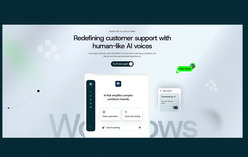 {"type":"@webflow/XscpData","payload":{"nodes":[{"_id":"97faa1db-349b-3bba-ec98-a833ba7d260d","type":"Section","tag":"section","classes":["5af8297b-0f31-6e6b-38a0-1089664ec4b3","e2e63ba6-b45f-9011-6b5c-8535adf14a9f","1e9202b7-0cbc-506e-2972-0bf806abb3a5"],"children":["2c069418-8f2b-2467-9fd1-825e863325b8","07f6d75d-e30f-5c3b-de13-baa544d1b2ac","b2ba9059-181d-8f4c-d11b-a44589c10dba","52f6790b-8356-f9fd-0e34-a200b7517037","4dbb6c32-e86e-855e-c1e4-13fe4270d4ef","3139cdf4-50d0-f69b-3b2f-bb1e626a0cde"],"data":{"tag":"section","devlink":{"runtimeProps":{},"slot":""},"displayName":"","attr":{"id":"Hero"},"xattr":[],"search":{"exclude":false},"visibility":{"conditions":[]},"grid":{"type":"section"}}},{"_id":"2c069418-8f2b-2467-9fd1-825e863325b8","type":"BlockContainer","tag":"div","classes":["d3c411fb-8f36-c077-055a-e24498c1a371"],"children":["746dd712-9449-7862-a16a-eea4bc24a89f","690fddd2-340e-fe3e-6437-87925513aaa7"],"data":{"tag":"div","devlink":{"runtimeProps":{},"slot":""},"displayName":"","attr":{"id":""},"xattr":[],"search":{"exclude":false},"visibility":{"conditions":[]},"grid":{"type":"container"}}},{"_id":"746dd712-9449-7862-a16a-eea4bc24a89f","type":"VFlex","tag":"div","classes":["65336fbe-3880-7477-fde2-038bee6491c6"],"children":["8944a8c2-fce7-a171-19a6-dd3fe6d55677"],"data":{"tag":"div","devlink":{"runtimeProps":{},"slot":""},"displayName":"","attr":{"id":""},"xattr":[],"search":{"exclude":false},"visibility":{"conditions":[]}}},{"_id":"8944a8c2-fce7-a171-19a6-dd3fe6d55677","type":"VFlex","tag":"div","classes":["f3cb06ed-f630-3e74-ff92-c4a8cbfdfcaf","7c0a6098-1443-6f28-d7a0-e8ac1ffebdeb"],"children":["dc075c34-c96e-85ad-6eea-0a637c8c1ed7","0f885257-cc4d-405f-7411-ee18e7014583","3d436a59-d479-8f92-f33a-4c863521f292","160473c0-c950-5f0f-1b58-7c264681f746"],"data":{"tag":"div","devlink":{"runtimeProps":{},"slot":""},"displayName":"","attr":{"id":""},"xattr":[],"search":{"exclude":false},"visibility":{"conditions":[]}}},{"_id":"dc075c34-c96e-85ad-6eea-0a637c8c1ed7","type":"Block","tag":"div","classes":["44006215-e230-fbd5-2831-ef5c69ac005b","d2f6b668-abeb-b33a-f5bb-bf854f9e0d22"],"children":["e2a9914c-923d-eab6-ff66-ee5295b063b7"],"data":{"text":true,"tag":"div","devlink":{"runtimeProps":{},"slot":""},"displayName":"","attr":{"id":""},"xattr":[],"search":{"exclude":false},"visibility":{"conditions":[]}}},{"_id":"e2a9914c-923d-eab6-ff66-ee5295b063b7","text":true,"v":"Adaptive AI Solutions"},{"_id":"0f885257-cc4d-405f-7411-ee18e7014583","type":"Block","tag":"div","classes":["8fd375d9-ad4e-5f93-ab7e-190b90b97e93"],"children":["c4476841-e343-3083-5379-168c19a9eaa6"],"data":{"text":false,"tag":"div","devlink":{"runtimeProps":{},"slot":""},"displayName":"","attr":{"id":""},"xattr":[],"search":{"exclude":false},"visibility":{"conditions":[]}}},{"_id":"c4476841-e343-3083-5379-168c19a9eaa6","type":"Heading","tag":"h1","classes":["e66552c7-64c6-dd22-ec9d-4a19769be5ce"],"children":["176b25f5-0518-9e48-9f24-37f9ba9abad5"],"data":{"tag":"h1","devlink":{"runtimeProps":{},"slot":""},"displayName":"","attr":{"id":""},"xattr":[],"search":{"exclude":false},"visibility":{"conditions":[]}}},{"_id":"176b25f5-0518-9e48-9f24-37f9ba9abad5","text":true,"v":"Redefining customer support with human-like AI voices"},{"_id":"3d436a59-d479-8f92-f33a-4c863521f292","type":"Block","tag":"div","classes":["16ece1fb-b0d8-0c24-031f-cf237e81aabb"],"children":["8f651fa7-3f43-31c7-8ec4-bbee9e6673fb"],"data":{"text":false,"tag":"div","devlink":{"runtimeProps":{},"slot":""},"displayName":"","attr":{"id":""},"xattr":[],"search":{"exclude":false},"visibility":{"conditions":[]}}},{"_id":"8f651fa7-3f43-31c7-8ec4-bbee9e6673fb","type":"Paragraph","tag":"p","classes":["e66552c7-64c6-dd22-ec9d-4a19769be5ce"],"children":["ce510e1a-ede4-1a17-2708-d73b9d48ceae"],"data":{"devlink":{"runtimeProps":{},"slot":""},"displayName":"","attr":{"id":""},"xattr":[],"search":{"exclude":false},"visibility":{"conditions":[]}}},{"_id":"ce510e1a-ede4-1a17-2708-d73b9d48ceae","text":true,"v":"Automate customer calls with lifelike AI voices that understand, respond, and deliver real-time personalized experiences."},{"_id":"160473c0-c950-5f0f-1b58-7c264681f746","type":"Block","tag":"div","classes":[],"children":["00318e1a-1a9d-6417-a8e8-e52b83b74acf"],"data":{"text":false,"tag":"div","devlink":{"runtimeProps":{},"slot":""},"displayName":"","attr":{"id":""},"xattr":[],"search":{"exclude":false},"visibility":{"conditions":[]}}},{"_id":"00318e1a-1a9d-6417-a8e8-e52b83b74acf","type":"Link","tag":"a","classes":["f8badeee-24d2-b4c2-8f26-b3427347dd57"],"children":["52297bb5-3bd5-46db-694e-a50b79713db5","466e18ba-ddfd-e630-16d6-ad43bbdd99ec","6534ff30-1a06-9754-55c0-fccd43238f62"],"data":{"button":false,"block":"inline","link":{"mode":"external","href":"#"},"eventIds":[],"attr":{"id":"","href":"#"},"devlink":{"runtimeProps":{},"slot":""},"displayName":"","xattr":[],"search":{"exclude":false},"visibility":{"conditions":[]}}},{"_id":"52297bb5-3bd5-46db-694e-a50b79713db5","type":"VFlex","tag":"div","classes":["f8badeee-24d2-b4c2-8f26-b3427347dd54"],"children":["7cd001b7-d2be-1fec-2f63-91bcff538c2c"],"data":{"tag":"div","devlink":{"runtimeProps":{},"slot":""},"displayName":"","attr":{"id":""},"xattr":[],"search":{"exclude":false},"visibility":{"conditions":[]}}},{"_id":"7cd001b7-d2be-1fec-2f63-91bcff538c2c","type":"Block","tag":"div","classes":["44006215-e230-fbd5-2831-ef5c69ac005c"],"children":["d650d5c4-557a-b768-46e8-3711d8e08811"],"data":{"text":true,"tag":"div","devlink":{"runtimeProps":{},"slot":""},"displayName":"","attr":{"id":""},"xattr":[],"search":{"exclude":false},"visibility":{"conditions":[]}}},{"_id":"d650d5c4-557a-b768-46e8-3711d8e08811","text":true,"v":"Try AI voice agent"},{"_id":"466e18ba-ddfd-e630-16d6-ad43bbdd99ec","type":"HFlex","tag":"div","classes":["f8badeee-24d2-b4c2-8f26-b3427347dd55"],"children":["eb73d8e5-f8cb-bd42-75f7-192d736f9ddf"],"data":{"tag":"div","devlink":{"runtimeProps":{},"slot":""},"displayName":"","attr":{"id":""},"xattr":[],"sea