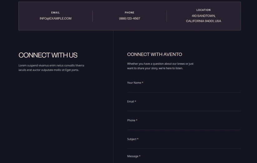 {"type":"@webflow/XscpData","payload":{"nodes":[{"_id":"4b1f20d2-640b-aa67-e45e-81bff3eff82e","type":"Section","tag":"section","classes":["1efa584f-498b-1a4c-632b-6e855cc101f3"],"children":["2fb552b8-4640-3f29-22cd-ba20921cfd25"],"data":{"tag":"section","devlink":{"runtimeProps":{},"slot":""},"displayName":"","attr":{"id":""},"xattr":[],"search":{"exclude":false},"visibility":{"conditions":[]},"grid":{"type":"section"}}},{"_id":"2fb552b8-4640-3f29-22cd-ba20921cfd25","type":"BlockContainer","tag":"div","classes":["4224882c-a739-01d2-8827-58b98f6e26e7"],"children":["b3dd4ac5-f3bb-bc4a-5363-df7e4d6309b5","a233d826-6508-49bf-1b04-ce3ca59d6fd4"],"data":{"tag":"div","devlink":{"runtimeProps":{},"slot":""},"displayName":"","attr":{"id":""},"xattr":[],"search":{"exclude":false},"visibility":{"conditions":[]},"grid":{"type":"container"}}},{"_id":"b3dd4ac5-f3bb-bc4a-5363-df7e4d6309b5","type":"HFlex","tag":"div","classes":["91a5c127-b25c-8902-9e0f-a06585fbcaf8"],"children":["d7dbdf32-648f-364e-7c62-72b3686f1417","1731f3a6-49e4-9d7a-a8eb-d44548655747","7f8f4b72-e7ff-c732-6be1-ac959493d1d3"],"data":{"tag":"div","devlink":{"runtimeProps":{},"slot":""},"displayName":"","attr":{"id":""},"xattr":[],"search":{"exclude":false},"visibility":{"conditions":[]}}},{"_id":"d7dbdf32-648f-364e-7c62-72b3686f1417","type":"VFlex","tag":"div","classes":["91a5c127-b25c-8902-9e0f-a06585fbcaf6"],"children":["d320d751-7dee-a44c-dd11-de6ecdd7b896","2d09546f-54c5-f666-e311-055420125394"],"data":{"tag":"div","devlink":{"runtimeProps":{},"slot":""},"displayName":"","attr":{"id":""},"xattr":[],"search":{"exclude":false},"visibility":{"conditions":[]}}},{"_id":"d320d751-7dee-a44c-dd11-de6ecdd7b896","type":"Block","tag":"div","classes":["c7c58f5c-8d7b-a6ff-f6ad-f92ad0b66840","87deaca2-2398-7ed1-4836-4449a5276621"],"children":["8ccd7a5a-bc9e-456a-f163-f34e973e78e0"],"data":{"text":false,"tag":"div","devlink":{"runtimeProps":{},"slot":""},"displayName":"","attr":{"id":""},"xattr":[],"search":{"exclude":false},"visibility":{"conditions":[]}}},{"_id":"8ccd7a5a-bc9e-456a-f163-f34e973e78e0","text":true,"v":"Email"},{"_id":"2d09546f-54c5-f666-e311-055420125394","type":"Link","tag":"a","classes":["4224882c-a739-01d2-8827-58b98f6e2694"],"children":["2d80b3e4-8cc4-d3ff-4132-55e9404aa78b"],"data":{"button":false,"block":"","link":{"mode":"email","email":"info@example.com"},"eventIds":[],"attr":{"id":""},"devlink":{"runtimeProps":{},"slot":""},"displayName":"","xattr":[],"search":{"exclude":false},"visibility":{"conditions":[]}}},{"_id":"2d80b3e4-8cc4-d3ff-4132-55e9404aa78b","text":true,"v":"info@example.com"},{"_id":"1731f3a6-49e4-9d7a-a8eb-d44548655747","type":"VFlex","tag":"div","classes":["91a5c127-b25c-8902-9e0f-a06585fbcaf6","47352597-857b-27b6-c6c5-b29797511c19"],"children":["0a2127bf-dfc8-f7cf-1fbe-802f1bd67ff8","5b101f72-76a4-1b78-14df-1538377013a4"],"data":{"tag":"div","devlink":{"runtimeProps":{},"slot":""},"displayName":"","attr":{"id":""},"xattr":[],"search":{"exclude":false},"visibility":{"conditions":[]}}},{"_id":"0a2127bf-dfc8-f7cf-1fbe-802f1bd67ff8","type":"Block","tag":"div","classes":["c7c58f5c-8d7b-a6ff-f6ad-f92ad0b66840","87deaca2-2398-7ed1-4836-4449a5276621"],"children":["9aec9bde-7999-1a94-2a2d-e3a13b517fcd"],"data":{"text":false,"tag":"div","devlink":{"runtimeProps":{},"slot":""},"displayName":"","attr":{"id":""},"xattr":[],"search":{"exclude":false},"visibility":{"conditions":[]}}},{"_id":"9aec9bde-7999-1a94-2a2d-e3a13b517fcd","text":true,"v":"Phone"},{"_id":"5b101f72-76a4-1b78-14df-1538377013a4","type":"Link","tag":"a","classes":["4224882c-a739-01d2-8827-58b98f6e2694"],"children":["bb9df7e8-d155-64ca-dc75-d12f7ae49c76"],"data":{"button":false,"block":"","link":{"mode":"tel","tel":"888 123 4567"},"eventIds":[],"attr":{"id":""},"devlink":{"runtimeProps":{},"slot":""},"displayName":"","xattr":[],"search":{"exclude":false},"visibility":{"conditions":[]}}},{"_id":"bb9df7e8-d155-64ca-dc75-d12f7ae49c76","text":true,"v":"(888) 123-4567"},{"_id":"7f8f4b72-e7ff-c732-6be1-ac959493d1d3","type":"VFlex","tag":"div","classes":["91a5c127-b25c-8902-9e0f-a06585fbcaf6"],"children":["1b53d5bc-1dd6-eca0-7104-944665b09ace","333bf591-7094-4fc1-73bf-4a1910351d65"],"data":{"tag":"div","devlink":{"runtimeProps":{},"slot":""},"displayName":"","attr":{"id":""},"xattr":[],"search":{"exclude":false},"visibility":{"conditions":[]}}},{"_id":"1b53d5bc-1dd6-eca0-7104-944665b09ace","type":"Block","tag":"div","classes":["c7c58f5c-8d7b-a6ff-f6ad-f92ad0b66840","87deaca2-2398-7ed1-4836-4449a5276621"],"children":["0ac25454-e912-9db1-764a-4b5ce24fc1ec"],"data":{"text":false,"tag":"div","devlink":{"runtimeProps":{},"slot":""},"displayName":"","attr":{"id":""},"xattr":[],"search":{"exclude":false},"visibility":{"conditions":[]}}},{"_id":"0ac25454-e912-9db1-764a-4b5ce24fc1ec","text":true,"v":"Location"},{"_id":"333bf591-7094-4fc1-73bf-4a1910351d65","type":"Block","tag":"div","classes":["4224882c-a739-01d2-8827-58b98f6e2694","7f3c1ca5-cf0c-af7e-e1ed-8ac1c9e5c4ea"],"children":["03113258-aba6-551d-b499-fae6d54651f8"],"data":{"text":true,"tag":"div","devlink":{"runtimeProps":{},"slot":""},"displayName":"","attr":{"id":""},"xattr":[],"search":{"exclude":false},"visibility":{"conditions":[]}}},{"_id":"03113258-aba6-551d-b499-fae6d54651f8","text":true,"v":"410 Sandtown, California 94001, USA"},{"_id":"a233d826-6508-49bf-1b04-ce3ca59d6fd4","type":"HFlex","tag":"div","classes":["1efa584f-498b-1a4c-632b-6e855cc101ee"],"children":["05a3edb1-529a-6263-be0d-2cad0ab4fa29","fe78f5ea-7337-b024-67e8-fa02a2f86ea1"],"data":{"tag":"div","devlink":{"runtimeProps":{},"slot":""},"displayName":"","attr":{"id":""},"xattr":[],"search":{"exclude":false},"visibility":{"conditions":[]}}},{"_id":"05a3edb1-529a-6263-be0d-2cad0ab4fa29","type":"Block","tag":"div","classes":["1efa584f-498b-1a4c-632b-6e855cc101e7"],"children":["44f14205-48c8-3df0-5fb0-09181546301a","89dcf67b-2cac-fe6f-2a75-6f8abb079f70"],"data":{"text":false,"tag":"div","devlink":{"runtimeProps":{},"slot":""},"displayName":""