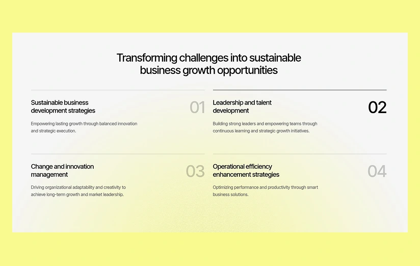 {"type":"@webflow/XscpData","payload":{"nodes":[{"_id":"13a019fe-eb2d-21b6-f06d-856f820f4dae","type":"Section","tag":"section","classes":[],"children":["11d19ac3-dd9f-cf4a-d9bf-cfb19ddc83da"],"data":{"tag":"section","devlink":{"runtimeProps":{},"slot":""},"displayName":"","attr":{"id":""},"xattr":[],"search":{"exclude":false},"visibility":{"conditions":[]},"grid":{"type":"section"}}},{"_id":"11d19ac3-dd9f-cf4a-d9bf-cfb19ddc83da","type":"BlockContainer","tag":"div","classes":["b8c6ae75-2cde-b91b-2655-eb13d2f26174"],"children":["31f20ca4-9e4c-9966-a7db-3bd5099b0765"],"data":{"tag":"div","devlink":{"runtimeProps":{},"slot":""},"displayName":"","attr":{"id":""},"xattr":[],"search":{"exclude":false},"visibility":{"conditions":[]},"grid":{"type":"container"}}},{"_id":"31f20ca4-9e4c-9966-a7db-3bd5099b0765","type":"HFlex","tag":"div","classes":["19a16718-9119-1cfc-aaf1-e6b3a4b62726"],"children":["749a14f9-c0b3-89c0-c542-ac3ff12eadd3","52e3cc9f-cb00-0c80-0de4-f4c5391d31d4"],"data":{"tag":"div","devlink":{"runtimeProps":{},"slot":""},"displayName":"","attr":{"id":""},"xattr":[],"search":{"exclude":false},"visibility":{"conditions":[]}}},{"_id":"749a14f9-c0b3-89c0-c542-ac3ff12eadd3","type":"VFlex","tag":"div","classes":["34230461-2e98-fb2a-98f1-429ff72ec935"],"children":["b9af8f4c-b4d8-5d20-8b9a-ecabedfd8245","65b20a67-8b86-06b1-a831-d1dba85801e5"],"data":{"tag":"div","devlink":{"runtimeProps":{},"slot":""},"displayName":"","attr":{"id":""},"xattr":[],"search":{"exclude":false},"visibility":{"conditions":[]}}},{"_id":"b9af8f4c-b4d8-5d20-8b9a-ecabedfd8245","type":"VFlex","tag":"div","classes":["d4754b9a-8eba-fd92-5c5c-8a13afe48629"],"children":["fe8761d6-72fe-6217-c76e-510bfc1aaf25","9c6a389d-003a-44c3-9409-61b1a9734918","06cb87d7-0547-3d57-eb3b-4a9f039918b4"],"data":{"tag":"div","devlink":{"runtimeProps":{},"slot":""},"displayName":"","attr":{"id":""},"xattr":[{"name":"box","value":""}],"search":{"exclude":false},"visibility":{"conditions":[]}}},{"_id":"fe8761d6-72fe-6217-c76e-510bfc1aaf25","type":"Heading","tag":"h2","classes":["d9a51ef0-0ab8-01c5-0d7d-7fccce4640bb","48f16039-4978-16a7-2096-bbb2ee1d3372"],"children":["9f58c646-bd41-31b9-c6b8-1348ee662a31"],"data":{"tag":"h2","devlink":{"runtimeProps":{},"slot":""},"displayName":"","attr":{"id":""},"xattr":[{"name":"heading","value":""}],"search":{"exclude":false},"visibility":{"conditions":[]}}},{"_id":"9f58c646-bd41-31b9-c6b8-1348ee662a31","text":true,"v":"Driving sustainable growth through strategic business solutions"},{"_id":"9c6a389d-003a-44c3-9409-61b1a9734918","type":"Block","tag":"div","classes":[],"children":["54f695e9-569c-587d-ed11-a7152432bc43"],"data":{"text":false,"tag":"div","devlink":{"runtimeProps":{},"slot":""},"displayName":"","attr":{"id":""},"xattr":[],"search":{"exclude":false},"visibility":{"conditions":[]}}},{"_id":"54f695e9-569c-587d-ed11-a7152432bc43","type":"Link","tag":"a","classes":["bf1038fa-3bf5-c9fd-25be-c46c1599f084","e3203a31-c40a-07a7-3a27-d5dec180ee69"],"children":["1b3be45c-d424-add4-7f57-c31f0f815a14","3fca5c74-9a1b-23c3-38fb-60805a67a12b"],"data":{"button":false,"block":"inline","link":{"mode":"external","href":"#"},"eventIds":[],"attr":{"id":"","href":"#"},"devlink":{"runtimeProps":{},"slot":""},"displayName":"","xattr":[],"search":{"exclude":false},"visibility":{"conditions":[]}}},{"_id":"1b3be45c-d424-add4-7f57-c31f0f815a14","type":"HFlex","tag":"div","classes":["cd4fccfd-3abb-2714-0382-a4af5080e6a1","e3203a31-c40a-07a7-3a27-d5dec180ee6a"],"children":["5795602d-ab78-56fe-5cba-238d1e382a31","46a1f7b7-18b2-31af-0479-4b25a66ef5f8"],"data":{"tag":"div","devlink":{"runtimeProps":{},"slot":""},"displayName":"","attr":{"id":""},"xattr":[],"search":{"exclude":false},"visibility":{"conditions":[]}}},{"_id":"5795602d-ab78-56fe-5cba-238d1e382a31","type":"Block","tag":"div","classes":["a0e31d35-8bd8-d51f-dbc4-fa366baa6585"],"children":["209a3f9a-d2b2-f112-fc32-4474616493dd"],"data":{"text":true,"tag":"div","devlink":{"runtimeProps":{},"slot":""},"displayName":"","attr":{"id":""},"xattr":[],"search":{"exclude":false},"visibility":{"conditions":[]}}},{"_id":"209a3f9a-d2b2-f112-fc32-4474616493dd","text":true,"v":"Start consulting now"},{"_id":"46a1f7b7-18b2-31af-0479-4b25a66ef5f8","type":"Block","tag":"div","classes":[],"children":["d4bef5ca-3f0a-2a0c-45af-dce5d83e3b7d"],"data":{"text":false,"tag":"div","devlink":{"runtimeProps":{},"slot":""},"displayName":"","attr":{"id":""},"xattr":[],"search":{"exclude":false},"visibility":{"conditions":[]}}},{"_id":"d4bef5ca-3f0a-2a0c-45af-dce5d83e3b7d","type":"Image","tag":"img","classes":["1e425cd7-27e7-c5e5-0334-70b732463e9d","e3203a31-c40a-07a7-3a27-d5dec180ee6b"],"children":[],"data":{"img":{"id":"68b94f8846bcb5743ffb597e"},"srcsetDisabled":false,"attr":{"width":"14","height":"11","alt":"__wf_reserved_inherit","loading":"lazy","id":""},"sizes":[],"devlink":{"runtimeProps":{},"slot":""},"displayName":"","xattr":[],"search":{"exclude":false},"visibility":{"conditions":[]}}},{"_id":"3fca5c74-9a1b-23c3-38fb-60805a67a12b","type":"Block","tag":"div","classes":["f02a2c30-b1c9-9b30-d166-cc3d43c27696","6c2f35d9-07e3-8d2b-dc89-be04bae27338","e3203a31-c40a-07a7-3a27-d5dec180ee6c"],"children":[],"data":{"text":false,"tag":"div","devlink":{"runtimeProps":{},"slot":""},"displayName":"","attr":{"id":""},"xattr":[],"search":{"exclude":false},"visibility":{"conditions":[]}}},{"_id":"06cb87d7-0547-3d57-eb3b-4a9f039918b4","type":"VFlex","tag":"div","classes":["ff83ab0a-9a1b-c6b1-6286-d53c5e261025","759e7725-6846-059f-e9bc-9c723392b8ee","56ceb9fb-2592-d377-d371-a41ad7b9046e"],"children":["3ba2d1ee-c041-688e-9ba5-892162cc27e4"],"data":{"tag":"div","devlink":{"runtimeProps":{},"slot":""},"displayName":"","attr":{"id":""},"xattr":[],"search":{"exclude":false},"visibility":{"conditions":[]}}},{"_id":"3ba2d1ee-c041-688e-9ba5-892162cc27e4","type":"Block","tag":"div","classes":["a87a76ee-13bd-7c84-8e1a-911859c5bb6a","14d2363a-4544-9ff6-b93c-70d2cfe444da"],"children":[],"data":{"text":false,"tag":"div","de
