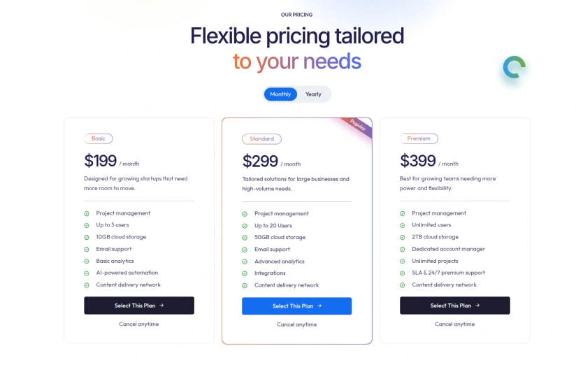 {"type":"@webflow/XscpData","payload":{"nodes":[{"_id":"7e1f43d3-6509-fb61-027f-3c6a185c12af","type":"Section","tag":"section","classes":["53de5c36-ab0e-6423-0ef1-0ba89ff1bcdc"],"children":["bebb029a-0018-e7e3-d5a9-175ebe8d1328"],"data":{"tag":"section","devlink":{"runtimeProps":{},"slot":""},"displayName":"","attr":{"id":""},"xattr":[],"search":{"exclude":false},"visibility":{"conditions":[]},"grid":{"type":"section"}}},{"_id":"bebb029a-0018-e7e3-d5a9-175ebe8d1328","type":"BlockContainer","tag":"div","classes":["8ef47bf6-f7fb-9136-fc25-4343e5846294"],"children":["34463e70-a2b3-b4c2-fef4-cec75f29c64f","6962fc00-f764-f1d7-4b2c-b1af452f821e"],"data":{"tag":"div","devlink":{"runtimeProps":{},"slot":""},"displayName":"","attr":{"id":""},"xattr":[],"search":{"exclude":false},"visibility":{"conditions":[]},"grid":{"type":"container"}}},{"_id":"34463e70-a2b3-b4c2-fef4-cec75f29c64f","type":"Grid","tag":"div","classes":["f88b312d-becd-7afe-183e-65aec7e60172","f88b312d-becd-7afe-183e-65aec7e601c2"],"children":["1ec1e15a-caf9-7594-84e9-43bd9ecb41ba","afad1585-14fd-a287-80d0-3ab06ae679e5","53bcedce-11cb-57ab-0fab-e3afcd39ce46"],"data":{"devlink":{"runtimeProps":{},"slot":""},"displayName":"","attr":{"id":""},"xattr":[],"search":{"exclude":false},"visibility":{"conditions":[]},"tag":"div","grid":"two-by-two"}},{"_id":"1ec1e15a-caf9-7594-84e9-43bd9ecb41ba","type":"VFlex","tag":"div","classes":["f88b312d-becd-7afe-183e-65aec7e60173"],"children":["6c20203c-d30b-40be-12c8-c0706204d9a0","60cf48c8-e46b-0cd2-3b7a-1924db9dd5a6","31817153-f3be-31f6-13dc-622461f28ee2","32270b15-1dc0-ed52-27f4-14a78a4a6c32"],"data":{"tag":"div","devlink":{"runtimeProps":{},"slot":""},"displayName":"","attr":{"id":""},"xattr":[],"search":{"exclude":false},"visibility":{"conditions":[]},"style":{"base":{"main":{"noPseudo":{}}}}}},{"_id":"6c20203c-d30b-40be-12c8-c0706204d9a0","type":"HFlex","tag":"div","classes":["f88b312d-becd-7afe-183e-65aec7e6019f"],"children":["ce29e739-cc19-ba10-b82e-e46a8baf38c6","8f9d8879-bcd7-6266-d73e-be56d5f39ec2"],"data":{"tag":"div","devlink":{"runtimeProps":{},"slot":""},"displayName":"","attr":{"id":""},"xattr":[],"search":{"exclude":false},"visibility":{"conditions":[]}}},{"_id":"ce29e739-cc19-ba10-b82e-e46a8baf38c6","type":"Block","tag":"div","classes":["c4bad152-d18d-0a5c-48b6-6fd4da21892e"],"children":["7cb110c6-b80d-0eec-fab3-cbc6e65615c6"],"data":{"text":false,"tag":"div","devlink":{"runtimeProps":{},"slot":""},"displayName":"","attr":{"id":""},"xattr":[],"search":{"exclude":false},"visibility":{"conditions":[]}}},{"_id":"7cb110c6-b80d-0eec-fab3-cbc6e65615c6","type":"Block","tag":"div","classes":["db3c7f58-41a7-6815-00ff-1cec4f6781ea"],"children":["d435c29b-449c-23dc-4a5a-92ec6cf7c99f"],"data":{"text":false,"tag":"div","devlink":{"runtimeProps":{},"slot":""},"displayName":"","attr":{"id":""},"xattr":[],"search":{"exclude":false},"visibility":{"conditions":[]}}},{"_id":"d435c29b-449c-23dc-4a5a-92ec6cf7c99f","type":"Block","tag":"div","classes":["8ef47bf6-f7fb-9136-fc25-4343e5846259"],"children":["c6ad390a-de55-50a4-87dd-b680ed0706a0"],"data":{"text":true,"tag":"div","devlink":{"runtimeProps":{},"slot":""},"displayName":"","attr":{"id":""},"xattr":[],"search":{"exclude":false},"visibility":{"conditions":[]}}},{"_id":"c6ad390a-de55-50a4-87dd-b680ed0706a0","text":true,"v":"Basic"},{"_id":"8f9d8879-bcd7-6266-d73e-be56d5f39ec2","type":"VFlex","tag":"div","classes":["f88b312d-becd-7afe-183e-65aec7e60192"],"children":["6d5e42b0-c467-f06f-c86d-7617a629b171","467664b2-8268-d60b-0aaf-2c9ff1ee4517"],"data":{"tag":"div","devlink":{"runtimeProps":{},"slot":""},"displayName":"","attr":{"id":""},"xattr":[],"search":{"exclude":false},"visibility":{"conditions":[]}}},{"_id":"6d5e42b0-c467-f06f-c86d-7617a629b171","type":"VFlex","tag":"div","classes":["f88b312d-becd-7afe-183e-65aec7e6014e"],"children":["943920f2-4e39-596b-6bb4-6846e66d3519","f4e7ff8d-8726-e29f-9a6f-b11d15bde2f8"],"data":{"tag":"div","devlink":{"runtimeProps":{},"slot":""},"displayName":"","attr":{"id":""},"xattr":[],"search":{"exclude":false},"visibility":{"conditions":[]}}},{"_id":"943920f2-4e39-596b-6bb4-6846e66d3519","type":"Block","tag":"div","classes":["f88b312d-becd-7afe-183e-65aec7e6017e"],"children":["f8cb50cd-ce0a-e18f-03b1-facb72c28b7e"],"data":{"text":true,"tag":"div","devlink":{"runtimeProps":{},"slot":""},"displayName":"","attr":{"id":""},"xattr":[],"search":{"exclude":false},"visibility":{"conditions":[]}}},{"_id":"f8cb50cd-ce0a-e18f-03b1-facb72c28b7e","text":true,"v":"$199"},{"_id":"f4e7ff8d-8726-e29f-9a6f-b11d15bde2f8","type":"Block","tag":"div","classes":["213e7355-5d7c-0d82-5e77-4f6f707b38c2","8c1c3430-34d8-3380-6abc-5a6252faefcd"],"children":["aeecc940-75c9-bd97-8283-4b2e595ce9dd"],"data":{"text":true,"tag":"div","devlink":{"runtimeProps":{},"slot":""},"displayName":"","attr":{"id":""},"xattr":[],"search":{"exclude":false},"visibility":{"conditions":[]}}},{"_id":"aeecc940-75c9-bd97-8283-4b2e595ce9dd","text":true,"v":"/ month"},{"_id":"467664b2-8268-d60b-0aaf-2c9ff1ee4517","type":"Block","tag":"div","classes":[],"children":["edeac8c9-563e-c73b-5206-961a36a90a87"],"data":{"text":true,"tag":"div","devlink":{"runtimeProps":{},"slot":""},"displayName":"","attr":{"id":""},"xattr":[],"search":{"exclude":false},"visibility":{"conditions":[]}}},{"_id":"edeac8c9-563e-c73b-5206-961a36a90a87","text":true,"v":"Designed for growing startups that need more room to move."},{"_id":"60cf48c8-e46b-0cd2-3b7a-1924db9dd5a6","type":"VFlex","tag":"div","classes":["f88b312d-becd-7afe-183e-65aec7e60168"],"children":["eb7d1dc7-6b31-96ec-2b30-baff1d51c8bb","0d22ba01-ce4f-e68c-57ad-efd9c5cf49ae","c0ae7f09-b02c-9bab-3488-d8532e19f539","1a7173dd-b279-2c58-ad13-7065775b20bb","84ccf1a2-3916-6ff0-3548-77416d8b8f32","9fe3c28e-ecb9-11bb-670b-d686425036ea","c069cc2c-ad31-c004-27fb-568eeef50d87"],"data":{"tag":"div","devlink":{"runtimeProps":{},"slot":""},"displayName":"","attr":{"id":""},"xattr":[],"search":{"exclude":false},"visibility":{"conditions":[]}}},{"_id":