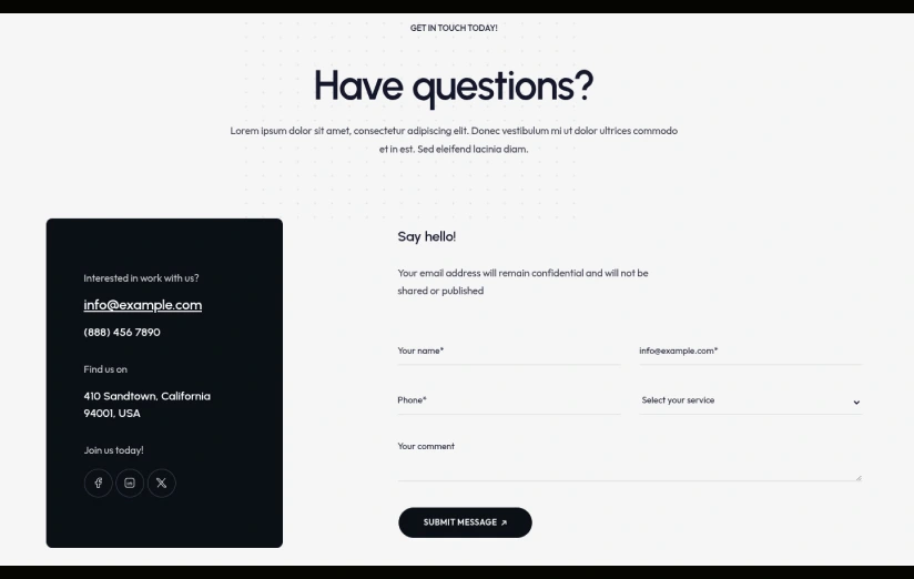 {"type":"@webflow/XscpData","payload":{"nodes":[{"_id":"b45da802-bacf-6f4f-9dfa-dedc589c9b96","type":"Section","tag":"section","classes":["0d5fda90-57e5-fd1c-7968-2410b55af152"],"children":["334f9e4a-ae38-58f1-7492-a550dc5cd6ba"],"data":{"tag":"section","devlink":{"runtimeProps":{},"slot":""},"displayName":"","attr":{"id":""},"xattr":[],"search":{"exclude":false},"visibility":{"conditions":[]},"grid":{"type":"section"}}},{"_id":"334f9e4a-ae38-58f1-7492-a550dc5cd6ba","type":"BlockContainer","tag":"div","classes":["71237809-4062-4f12-9ff7-240eae7cd250"],"children":["936fd3c4-720c-be92-eaa8-04e32441a0c5","68070013-0dd0-89be-5648-8ece81189dd8","b5f4c9a6-739f-bf55-92be-2fbc0624c03b","3e055c8b-1926-1d4e-42f7-4654a51f6457"],"data":{"tag":"div","devlink":{"runtimeProps":{},"slot":""},"displayName":"","attr":{"id":""},"xattr":[],"search":{"exclude":false},"visibility":{"conditions":[]},"grid":{"type":"container"}}},{"_id":"936fd3c4-720c-be92-eaa8-04e32441a0c5","type":"Block","tag":"div","classes":["bd2368ee-87b3-38b0-d2a3-6e2179da5364","ba9c9a1d-3a20-95d9-2f7a-cb4ecdc4198f","ba9c9a1d-3a20-95d9-2f7a-cb4ecdc41996"],"children":["3f680f5b-e95f-2749-799e-44f04bd12944"],"data":{"text":true,"tag":"div","devlink":{"runtimeProps":{},"slot":""},"displayName":"","attr":{"id":""},"xattr":[],"search":{"exclude":false},"visibility":{"conditions":[]}}},{"_id":"3f680f5b-e95f-2749-799e-44f04bd12944","text":true,"v":"get in touch today!"},{"_id":"68070013-0dd0-89be-5648-8ece81189dd8","type":"Block","tag":"div","classes":["ac073055-3fae-de32-f944-965a0037fce3","5689648f-7288-9186-8185-4c5fa2cdaffa"],"children":["c8a7e7a5-254d-64d2-0d84-11273d49bf30"],"data":{"text":false,"tag":"div","devlink":{"runtimeProps":{},"slot":""},"displayName":"","attr":{"id":""},"xattr":[],"search":{"exclude":false},"visibility":{"conditions":[]}}},{"_id":"c8a7e7a5-254d-64d2-0d84-11273d49bf30","type":"Heading","tag":"h1","classes":["bd2368ee-87b3-38b0-d2a3-6e2179da5359","294eca32-2c13-7aa5-2469-82f9b903dd7c","b56180ee-95a4-6b7d-a4c2-37f0c2e6c8cf","835b214e-9293-1f3d-bf88-f8c2754aa542"],"children":["22564129-b760-3658-f7c3-a9f61af47936"],"data":{"tag":"h1","devlink":{"runtimeProps":{},"slot":""},"displayName":"","attr":{"id":""},"xattr":[],"search":{"exclude":false},"visibility":{"conditions":[]}}},{"_id":"22564129-b760-3658-f7c3-a9f61af47936","text":true,"v":"Have questions?"},{"_id":"b5f4c9a6-739f-bf55-92be-2fbc0624c03b","type":"Block","tag":"div","classes":["bb0da730-391d-6168-5bc9-3b79fec4fb9d","0008b3fd-665c-fa91-2c0c-5d3111cb5e78"],"children":["8163ff65-5775-4d76-886e-78bcd2c859f4"],"data":{"text":false,"tag":"div","devlink":{"runtimeProps":{},"slot":""},"displayName":"","attr":{"id":""},"xattr":[],"search":{"exclude":false},"visibility":{"conditions":[]}}},{"_id":"8163ff65-5775-4d76-886e-78bcd2c859f4","type":"Paragraph","tag":"p","classes":["bd2368ee-87b3-38b0-d2a3-6e2179da5359","294eca32-2c13-7aa5-2469-82f9b903dd7c"],"children":["f4b5a9d2-bce8-e810-cf54-b14eadc2f6e4"],"data":{"devlink":{"runtimeProps":{},"slot":""},"displayName":"","attr":{"id":""},"xattr":[],"search":{"exclude":false},"visibility":{"conditions":[]}}},{"_id":"f4b5a9d2-bce8-e810-cf54-b14eadc2f6e4","text":true,"v":"Lorem ipsum dolor sit amet, consectetur adipiscing elit. Donec vestibulum mi ut dolor ultrices commodo et in est. Sed eleifend lacinia diam."},{"_id":"3e055c8b-1926-1d4e-42f7-4654a51f6457","type":"Block","tag":"div","classes":["43724b62-2cd8-860c-4701-fefedb16a4c5"],"children":["82b10a10-35cc-93b1-6163-dc3a9c01fd8e","227bfc56-28c3-7b88-bf42-55c7924adc87"],"data":{"text":false,"tag":"div","devlink":{"runtimeProps":{},"slot":""},"displayName":"","attr":{"id":""},"xattr":[],"search":{"exclude":false},"visibility":{"conditions":[]}}},{"_id":"82b10a10-35cc-93b1-6163-dc3a9c01fd8e","type":"Block","tag":"div","classes":["b237a9d3-985e-2eee-ea09-d8fb86ff1649"],"children":["0b3525ac-50f4-c54b-4e7b-765404156ed3","e93ca358-30b7-830d-00ba-040165ff90a8","d0c30182-db24-41c8-1d83-3d0aab8425ba"],"data":{"text":false,"tag":"div","devlink":{"runtimeProps":{},"slot":""},"displayName":"","attr":{"id":""},"xattr":[],"search":{"exclude":false},"visibility":{"conditions":[]}}},{"_id":"0b3525ac-50f4-c54b-4e7b-765404156ed3","type":"Block","tag":"div","classes":["76586bef-1e87-f84b-cd06-d5581f7e4ad9"],"children":["ccad7ade-e18d-b155-22ca-714aba7b6967","6ab777d4-352e-3a8a-f2e0-81a8929a3ae2","e5e7246e-b30d-9183-2242-42337908f107"],"data":{"text":false,"tag":"div","devlink":{"runtimeProps":{},"slot":""},"displayName":"","attr":{"id":""},"xattr":[],"search":{"exclude":false},"visibility":{"conditions":[]}}},{"_id":"ccad7ade-e18d-b155-22ca-714aba7b6967","type":"Block","tag":"div","classes":["bd2368ee-87b3-38b0-d2a3-6e2179da5367"],"children":["21bb95df-3725-199f-3b92-aaf3ca1c5db8"],"data":{"text":true,"tag":"div","devlink":{"runtimeProps":{},"slot":""},"displayName":"","attr":{"id":""},"xattr":[],"search":{"exclude":false},"visibility":{"conditions":[]}}},{"_id":"21bb95df-3725-199f-3b92-aaf3ca1c5db8","text":true,"v":"Interested in work with us?"},{"_id":"6ab777d4-352e-3a8a-f2e0-81a8929a3ae2","type":"Link","tag":"a","classes":["bd2368ee-87b3-38b0-d2a3-6e2179da534d","8db43f88-35c6-891d-81e9-da7a127cf6e3","1de345c8-0cb0-67e2-93f3-51795c131db0"],"children":["d7bbe8b0-19bd-8f5f-655e-1da422ac004d"],"data":{"button":false,"block":"","link":{"mode":"email","email":"info@example.com"},"eventIds":[],"attr":{"id":""},"devlink":{"runtimeProps":{},"slot":""},"displayName":"","xattr":[],"search":{"exclude":false},"visibility":{"conditions":[]}}},{"_id":"d7bbe8b0-19bd-8f5f-655e-1da422ac004d","text":true,"v":"info@example.com"},{"_id":"e5e7246e-b30d-9183-2242-42337908f107","type":"Link","tag":"a","classes":["bd2368ee-87b3-38b0-d2a3-6e2179da5355","65bc6fff-ef4c-9226-c8f8-dff2b534f214","5f6f12cf-46f7-a390-6b77-502acbc1d478"],"children":["83816860-9ee1-e9e1-a1fa-884ab32cd51d"],"data":{"button":false,"block":"","link":{"mode":"tel","tel":"8884567890"},"eventIds":[],"attr":{"id":""},"devlink":{"runtimeProps":