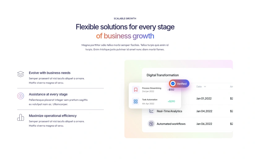{"type":"@webflow/XscpData","payload":{"nodes":[{"_id":"2c8d9a07-2b5a-9776-8712-2a11686b8ddd","type":"Section","tag":"section","classes":["f88b312d-becd-7afe-183e-65aec7e6018f"],"children":["8624b4f1-1331-1e50-8ee9-5f9550abc303"],"data":{"tag":"section","devlink":{"runtimeProps":{},"slot":""},"displayName":"","attr":{"id":""},"xattr":[],"search":{"exclude":false},"visibility":{"conditions":[]},"grid":{"type":"section"}}},{"_id":"8624b4f1-1331-1e50-8ee9-5f9550abc303","type":"BlockContainer","tag":"div","classes":["8ef47bf6-f7fb-9136-fc25-4343e5846294"],"children":["2d458a77-9b94-7bb8-b096-e9b76f5cf34c","18ff4770-154a-60a5-2576-56b7f9f78265","cccd169a-1cac-1842-9aef-af9cd9efbb36"],"data":{"tag":"div","devlink":{"runtimeProps":{},"slot":""},"displayName":"","attr":{"id":""},"xattr":[],"search":{"exclude":false},"visibility":{"conditions":[]},"grid":{"type":"container"}}},{"_id":"2d458a77-9b94-7bb8-b096-e9b76f5cf34c","type":"VFlex","tag":"div","classes":["f88b312d-becd-7afe-183e-65aec7e60185","f88b312d-becd-7afe-183e-65aec7e601cf","eae8e58f-4cbd-782b-ff4d-0373bb0a633d"],"children":["af06baab-3ad2-4339-be37-d910ee292676","84923f03-c9f8-c781-1969-a21d56986767","abe162b4-4309-7f5b-7b83-69c7ae14aabc"],"data":{"tag":"div","devlink":{"runtimeProps":{},"slot":""},"displayName":"","attr":{"id":""},"xattr":[],"search":{"exclude":false},"visibility":{"conditions":[]}}},{"_id":"af06baab-3ad2-4339-be37-d910ee292676","type":"Block","tag":"div","classes":["8ef47bf6-f7fb-9136-fc25-4343e584622c"],"children":["aeba4052-7350-19c8-7362-acc12199dd2f"],"data":{"text":false,"tag":"div","devlink":{"runtimeProps":{},"slot":""},"displayName":"","attr":{"id":""},"xattr":[],"search":{"exclude":false},"visibility":{"conditions":[]}}},{"_id":"aeba4052-7350-19c8-7362-acc12199dd2f","type":"Block","tag":"div","classes":["8ef47bf6-f7fb-9136-fc25-4343e58462cd","8ef47bf6-f7fb-9136-fc25-4343e5846311"],"children":["0a84082f-3e9b-8c64-85be-33d32fac81b4"],"data":{"text":true,"tag":"div","devlink":{"runtimeProps":{},"slot":""},"displayName":"","attr":{"id":""},"xattr":[],"search":{"exclude":false},"visibility":{"conditions":[]}}},{"_id":"0a84082f-3e9b-8c64-85be-33d32fac81b4","text":true,"v":"Scalable Growth"},{"_id":"84923f03-c9f8-c781-1969-a21d56986767","type":"Block","tag":"div","classes":["8ef47bf6-f7fb-9136-fc25-4343e584622c"],"children":["75a72e5c-a214-9a04-b334-7e5f4239432c"],"data":{"text":false,"tag":"div","devlink":{"runtimeProps":{},"slot":""},"displayName":"","attr":{"id":""},"xattr":[],"search":{"exclude":false},"visibility":{"conditions":[]}}},{"_id":"75a72e5c-a214-9a04-b334-7e5f4239432c","type":"Heading","tag":"h2","classes":["8ef47bf6-f7fb-9136-fc25-4343e5846249","8ef47bf6-f7fb-9136-fc25-4343e5846314"],"children":["affd1f51-da06-456b-3111-7a0fabf436df","57a5e77f-1ff9-82f9-e5ea-ff1754c4294c"],"data":{"tag":"h2","devlink":{"runtimeProps":{},"slot":""},"displayName":"","attr":{"id":""},"xattr":[],"search":{"exclude":false},"visibility":{"conditions":[]}}},{"_id":"affd1f51-da06-456b-3111-7a0fabf436df","text":true,"v":"Flexible solutions for every stage "},{"_id":"57a5e77f-1ff9-82f9-e5ea-ff1754c4294c","type":"Span","tag":"span","classes":["8ef47bf6-f7fb-9136-fc25-4343e5846259"],"children":["1de9a3ca-1e39-0105-5c40-4d8db599de19"],"data":{"devlink":{"runtimeProps":{},"slot":""},"displayName":"","attr":{"id":""},"xattr":[],"search":{"exclude":false},"visibility":{"conditions":[]}}},{"_id":"1de9a3ca-1e39-0105-5c40-4d8db599de19","text":true,"v":"of business growth"},{"_id":"abe162b4-4309-7f5b-7b83-69c7ae14aabc","type":"Paragraph","tag":"p","classes":["8ef47bf6-f7fb-9136-fc25-4343e5846249","f88b312d-becd-7afe-183e-65aec7e601bb"],"children":["131d5e51-58ca-8161-9fc7-8351cc27b2cf"],"data":{"devlink":{"runtimeProps":{},"slot":""},"displayName":"","attr":{"id":""},"xattr":[],"search":{"exclude":false},"visibility":{"conditions":[]}}},{"_id":"131d5e51-58ca-8161-9fc7-8351cc27b2cf","text":true,"v":"Magna porttitor odio tellus morbi semper facilisis. Tellus turpis quis enim id turpis. Enim tristique justo pulvinar id amet nunc diam morbi fames."},{"_id":"18ff4770-154a-60a5-2576-56b7f9f78265","type":"HFlex","tag":"div","classes":["f88b312d-becd-7afe-183e-65aec7e60198"],"children":["abd640b9-d993-adf8-fa22-267043b8adbc","4c720c9d-2322-01da-34c1-f01c6ddc9574"],"data":{"tag":"div","devlink":{"runtimeProps":{},"slot":""},"displayName":"","attr":{"id":""},"xattr":[],"search":{"exclude":false},"visibility":{"conditions":[]}}},{"_id":"abd640b9-d993-adf8-fa22-267043b8adbc","type":"VFlex","tag":"div","classes":["f88b312d-becd-7afe-183e-65aec7e60195"],"children":["551f38fb-d5af-0016-4d4f-8937b0da804c","de2dbcb1-ed59-db7d-ac92-7309fe982605","5ce5e0f1-5101-136e-f627-3c90a8db79dc"],"data":{"tag":"div","devlink":{"runtimeProps":{},"slot":""},"displayName":"","attr":{"id":""},"xattr":[],"search":{"exclude":false},"visibility":{"conditions":[]}}},{"_id":"551f38fb-d5af-0016-4d4f-8937b0da804c","type":"HFlex","tag":"div","classes":["f88b312d-becd-7afe-183e-65aec7e60191"],"children":["96809b81-ce4c-9df3-f7bf-d40f1b15ea79","106e8312-9576-ddd8-2b00-c3f3dbad842f"],"data":{"tag":"div","devlink":{"runtimeProps":{},"slot":""},"displayName":"","attr":{"id":""},"xattr":[],"search":{"exclude":false},"visibility":{"conditions":[]}}},{"_id":"96809b81-ce4c-9df3-f7bf-d40f1b15ea79","type":"VFlex","tag":"div","classes":["f88b312d-becd-7afe-183e-65aec7e601a3"],"children":["f90e1ff9-4834-e66c-e42b-c1f4a1816b62"],"data":{"tag":"div","devlink":{"runtimeProps":{},"slot":""},"displayName":"","attr":{"id":""},"xattr":[],"search":{"exclude":false},"visibility":{"conditions":[]}}},{"_id":"f90e1ff9-4834-e66c-e42b-c1f4a1816b62","type":"Image","tag":"img","classes":[],"children":[],"data":{"img":{"id":"687db5f9a2531e776d31bda7"},"srcsetDisabled":false,"attr":{"width":"40","height":"36","alt":"__wf_reserved_inherit","src":"https://cdn.prod.website-files.com/687db5f9a2531e776d31b9cf/687db5f9a2531e776d31bda7_Vector%20(5)%20(3rd%20copy).svg","loading":"lazy","id":""},"sizes":[],"devlin