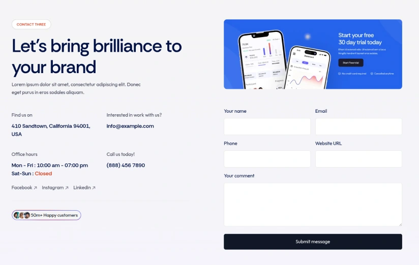 {"type":"@webflow/XscpData","payload":{"nodes":[{"_id":"1fe8a2b3-47a7-02b0-8af9-7dc2567e5134","type":"Section","tag":"section","classes":["de17217c-35a2-0a28-f87e-5f8142d40853"],"children":["9f06bc85-a00f-efd7-7765-30d854c38d8d"],"data":{"tag":"section","devlink":{"runtimeProps":{},"slot":""},"displayName":"","attr":{"id":""},"xattr":[],"search":{"exclude":false},"visibility":{"conditions":[]},"grid":{"type":"section"}}},{"_id":"9f06bc85-a00f-efd7-7765-30d854c38d8d","type":"BlockContainer","tag":"div","classes":["3e7fbc71-d2f6-e3d3-8316-76c2adeffa97"],"children":["3a3cd826-38b4-b2d4-142a-d9d12f23e49d"],"data":{"tag":"div","devlink":{"runtimeProps":{},"slot":""},"displayName":"","attr":{"id":""},"xattr":[],"search":{"exclude":false},"visibility":{"conditions":[]},"grid":{"type":"container"}}},{"_id":"3a3cd826-38b4-b2d4-142a-d9d12f23e49d","type":"Block","tag":"div","classes":["b00d6eb6-b077-b583-90fd-b6b3bc7fad11"],"children":["b5e21715-629f-f8e6-4a26-2b014b1a650b","f252772f-d5b4-50f7-ad85-a1189ec17177"],"data":{"text":false,"tag":"div","devlink":{"runtimeProps":{},"slot":""},"displayName":"","attr":{"id":""},"xattr":[],"search":{"exclude":false},"visibility":{"conditions":[]}}},{"_id":"b5e21715-629f-f8e6-4a26-2b014b1a650b","type":"Block","tag":"div","classes":["d5457f18-331e-6eaa-fb6b-cd2eaba42d1b"],"children":["d0ae3508-b0ff-c9d3-d148-f545abe8ee06","8ac91807-2b77-e45e-fb5e-f4e3c05eae6d","b792f6ca-09b3-6842-7ba6-5c55150c448e","42971420-5943-4ad0-d090-fda2114b9307","e0154366-0e52-9fee-6e08-9be5f185e34e"],"data":{"text":false,"tag":"div","devlink":{"runtimeProps":{},"slot":""},"displayName":"","attr":{"id":""},"xattr":[],"search":{"exclude":false},"visibility":{"conditions":[]}}},{"_id":"d0ae3508-b0ff-c9d3-d148-f545abe8ee06","type":"Block","tag":"div","classes":["475949ab-bf2d-28d0-241e-826c895043b1","ef394c6e-0c5a-4516-0361-8a12ccb49f61"],"children":["ce46c3e0-0069-5409-c0ac-77285a7095f6"],"data":{"text":false,"tag":"div","devlink":{"runtimeProps":{},"slot":""},"displayName":"","attr":{"id":""},"xattr":[],"search":{"exclude":false},"visibility":{"conditions":[]}}},{"_id":"ce46c3e0-0069-5409-c0ac-77285a7095f6","type":"Block","tag":"div","classes":["9ab97c1c-ac48-7e8f-447a-e8162db0446a","ef394c6e-0c5a-4516-0361-8a12ccb49f62"],"children":["04fc5a0a-1f8c-f4c7-193e-bae6d7882372"],"data":{"text":true,"tag":"div","devlink":{"runtimeProps":{},"slot":""},"displayName":"","attr":{"id":""},"xattr":[],"search":{"exclude":false},"visibility":{"conditions":[]}}},{"_id":"04fc5a0a-1f8c-f4c7-193e-bae6d7882372","text":true,"v":"contact three"},{"_id":"8ac91807-2b77-e45e-fb5e-f4e3c05eae6d","type":"Block","tag":"div","classes":["0a1335f8-774c-2581-927b-47e3f29ada55","2b75e3a6-578a-aca4-f3a1-63c631bd68db","d744872f-2fcf-c9f8-b1cd-1784f746455f"],"children":["36863036-b242-b4d1-af08-de9b9a066c20"],"data":{"text":false,"tag":"div","devlink":{"runtimeProps":{},"slot":""},"displayName":"","attr":{"id":""},"xattr":[],"search":{"exclude":false},"visibility":{"conditions":[]}}},{"_id":"36863036-b242-b4d1-af08-de9b9a066c20","type":"Heading","tag":"h1","classes":["9ab97c1c-ac48-7e8f-447a-e8162db0446e"],"children":["dfc25883-0bb8-1c10-b96a-533410b3cf37"],"data":{"tag":"h1","devlink":{"runtimeProps":{},"slot":""},"displayName":"","attr":{"id":""},"xattr":[],"search":{"exclude":false},"visibility":{"conditions":[]}}},{"_id":"dfc25883-0bb8-1c10-b96a-533410b3cf37","text":true,"v":"Let’s bring brilliance to your brand"},{"_id":"b792f6ca-09b3-6842-7ba6-5c55150c448e","type":"Block","tag":"div","classes":["af6e4250-5ebf-6829-f7b7-8376df7a6a37","7529f529-9885-2c17-ed03-881ca6ed2b8e"],"children":["b3531b33-4a2b-025b-d5fa-d1afa23350a5"],"data":{"text":false,"tag":"div","devlink":{"runtimeProps":{},"slot":""},"displayName":"","attr":{"id":""},"xattr":[],"search":{"exclude":false},"visibility":{"conditions":[]}}},{"_id":"b3531b33-4a2b-025b-d5fa-d1afa23350a5","type":"Paragraph","tag":"p","classes":["9ab97c1c-ac48-7e8f-447a-e8162db0446e"],"children":["cdbc94ed-3318-5c2c-a5c3-a86f369cb1b1"],"data":{"devlink":{"runtimeProps":{},"slot":""},"displayName":"","attr":{"id":""},"xattr":[],"search":{"exclude":false},"visibility":{"conditions":[]}}},{"_id":"cdbc94ed-3318-5c2c-a5c3-a86f369cb1b1","text":true,"v":"Lorem ipsum dolor sit amet, consectetur adipiscing elit. Donec eget purus in eros sodales aliquam."},{"_id":"42971420-5943-4ad0-d090-fda2114b9307","type":"Block","tag":"div","classes":["b80c0118-3921-da3c-cfe6-30cc2f1e6609","e280ef00-2a51-eebf-56b7-1153e3c13941"],"children":["5e2a21bd-35d7-28c3-d6ee-e029afb8ccac","897afc0d-aa0d-a785-9ddc-9020073cd5fd","4cf7a30c-fc6b-46ba-b2bd-6da5f28c9873","c24e5264-e22a-d1d2-970b-a3dd55a8eabf"],"data":{"text":false,"tag":"div","devlink":{"runtimeProps":{},"slot":""},"displayName":"","attr":{"id":""},"xattr":[],"search":{"exclude":false},"visibility":{"conditions":[]}}},{"_id":"5e2a21bd-35d7-28c3-d6ee-e029afb8ccac","type":"Block","tag":"div","classes":["a9c551c0-11d6-8ce5-fe08-741c12d18b4d"],"children":["74ab3387-4529-296a-62b3-0febb1c8e061","592e2619-8bf9-618d-590f-3adf5bf0c751"],"data":{"text":false,"tag":"div","devlink":{"runtimeProps":{},"slot":""},"displayName":"","attr":{"id":""},"xattr":[],"search":{"exclude":false},"visibility":{"conditions":[]}}},{"_id":"74ab3387-4529-296a-62b3-0febb1c8e061","type":"Block","tag":"div","classes":[],"children":["522be941-0161-765c-5b18-6a34612a2d80"],"data":{"text":true,"tag":"div","devlink":{"runtimeProps":{},"slot":""},"displayName":"","attr":{"id":""},"xattr":[],"search":{"exclude":false},"visibility":{"conditions":[]}}},{"_id":"522be941-0161-765c-5b18-6a34612a2d80","text":true,"v":"Find us on"},{"_id":"592e2619-8bf9-618d-590f-3adf5bf0c751","type":"Block","tag":"div","classes":["09510349-018f-eca2-1199-ebe299fa4cc3"],"children":["98ba6c2f-0d5f-a66c-8fe4-1261141f7363"],"data":{"text":true,"tag":"div","devlink":{"runtimeProps":{},"slot":""},"displayName":"","attr":{"id":""},"xattr":[],"search":{"exclude":false},"visibility":{"conditions":[]}}},{"_id":"98ba6c2f-0