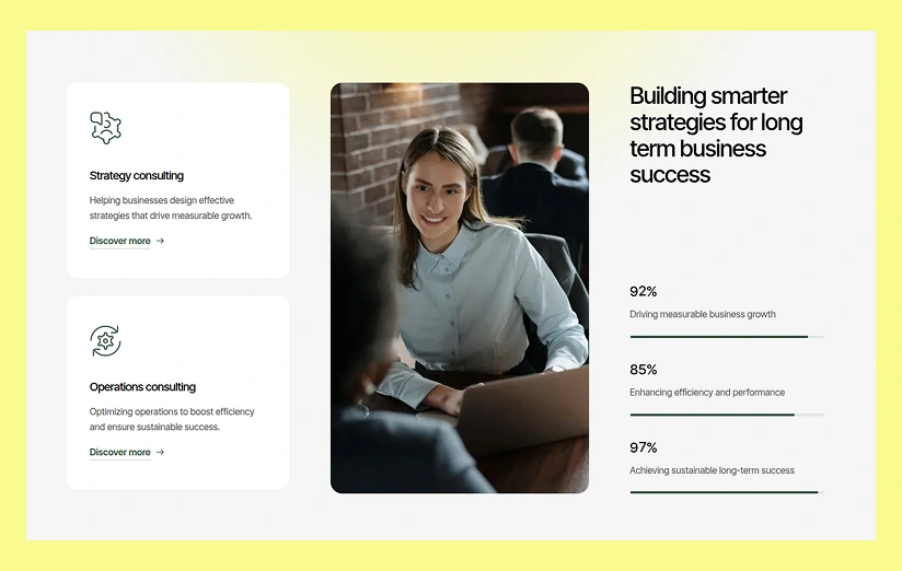 {"type":"@webflow/XscpData","payload":{"nodes":[{"_id":"57e29349-ff9b-cf80-763f-24783ff9aa02","type":"Section","tag":"section","classes":["bae3a731-43c2-df20-ee20-f526c6c019e0"],"children":["94f61f02-7716-165c-81f3-18b9faaeb54d"],"data":{"tag":"section","devlink":{"runtimeProps":{},"slot":""},"displayName":"","attr":{"id":""},"xattr":[],"search":{"exclude":false},"visibility":{"conditions":[]},"grid":{"type":"section"}}},{"_id":"94f61f02-7716-165c-81f3-18b9faaeb54d","type":"BlockContainer","tag":"div","classes":["b8c6ae75-2cde-b91b-2655-eb13d2f26174"],"children":["3bf1b87e-612c-0c2a-3826-7625d3d5e3f3"],"data":{"tag":"div","devlink":{"runtimeProps":{},"slot":""},"displayName":"","attr":{"id":""},"xattr":[],"search":{"exclude":false},"visibility":{"conditions":[]},"grid":{"type":"container"}}},{"_id":"3bf1b87e-612c-0c2a-3826-7625d3d5e3f3","type":"HFlex","tag":"div","classes":["8074151f-8e84-27cd-1686-803046666636"],"children":["565e2762-659f-01dc-d434-ece6ce8d7a71","d29fade7-75bc-6edd-74cc-7d3fef96ab94","88a9269f-eb5c-8e9f-959f-24a24a3f2d61"],"data":{"tag":"div","devlink":{"runtimeProps":{},"slot":""},"displayName":"","attr":{"id":""},"xattr":[],"search":{"exclude":false},"visibility":{"conditions":[]}}},{"_id":"565e2762-659f-01dc-d434-ece6ce8d7a71","type":"VFlex","tag":"div","classes":["ebaac74f-d408-4c90-dfa9-f6d4b6d520df","b2550f72-64af-4628-c67e-374635d54920"],"children":["07943543-14f2-2c15-d26f-a7d9b6da608b","8642c072-0512-fcac-b3ee-af841345ebcd"],"data":{"tag":"div","devlink":{"runtimeProps":{},"slot":""},"displayName":"","attr":{"id":""},"xattr":[],"search":{"exclude":false},"visibility":{"conditions":[]},"style":{"base":{"medium":{"noPseudo":{"gridColumnStart":"span 2","gridColumnEnd":"span 2","gridRowStart":"span 1","gridRowEnd":"span 1"}},"tiny":{"noPseudo":{"gridColumnStart":"span 1","gridColumnEnd":"span 1"}}}}}},{"_id":"07943543-14f2-2c15-d26f-a7d9b6da608b","type":"VFlex","tag":"div","classes":["d091d8f5-930e-5aa6-ed56-a696967f5672","a58cb920-3de2-9cbf-e980-5f831bd8b5d9"],"children":["bbcd218b-7aa8-d998-3981-e97c1135122e","8b631663-e70d-35dc-26f0-39e76ed77623","54a5020b-9e7a-4606-9747-03814e8dc34f","d21e9590-2ba2-82d6-a542-4b191dcdcaab","bf96cb57-6e50-ff73-f24b-6e7a476669eb"],"data":{"tag":"div","devlink":{"runtimeProps":{},"slot":""},"displayName":"","attr":{"id":""},"xattr":[],"search":{"exclude":false},"visibility":{"conditions":[]}}},{"_id":"bbcd218b-7aa8-d998-3981-e97c1135122e","type":"Block","tag":"div","classes":["6ab1abec-d85c-714a-96a8-b88785ca6d9a"],"children":["7cacd563-839d-7836-6aa1-ee1f25b41135"],"data":{"text":false,"tag":"div","devlink":{"runtimeProps":{},"slot":""},"displayName":"","attr":{"id":""},"xattr":[],"search":{"exclude":false},"visibility":{"conditions":[]}}},{"_id":"7cacd563-839d-7836-6aa1-ee1f25b41135","type":"Image","tag":"img","classes":[],"children":[],"data":{"img":{"id":"68e35354a1e9b286888a91ac"},"srcsetDisabled":false,"attr":{"width":"54","height":"56","alt":"__wf_reserved_inherit","src":"https://cdn.prod.website-files.com/6667e1295d7fb05ba4fa34fe/68e35354a1e9b286888a91ac_Consulting%20icon%20green.svg","loading":"lazy","id":""},"sizes":[],"devlink":{"runtimeProps":{},"slot":""},"displayName":"","xattr":[],"search":{"exclude":false},"visibility":{"conditions":[]}}},{"_id":"8b631663-e70d-35dc-26f0-39e76ed77623","type":"Block","tag":"div","classes":["284c8d80-c10d-85ec-5b7c-1aaeb52b986d"],"children":["c24264de-5c71-08fb-dfcc-c5bdd43898f9"],"data":{"text":true,"tag":"div","devlink":{"runtimeProps":{},"slot":""},"displayName":"","attr":{"id":""},"xattr":[],"search":{"exclude":false},"visibility":{"conditions":[]}}},{"_id":"c24264de-5c71-08fb-dfcc-c5bdd43898f9","text":true,"v":"Strategy consulting"},{"_id":"54a5020b-9e7a-4606-9747-03814e8dc34f","type":"Paragraph","tag":"p","classes":["d9a51ef0-0ab8-01c5-0d7d-7fccce4640bb"],"children":["20d1e19e-5cfe-3e29-9db0-6de5f5022297"],"data":{"devlink":{"runtimeProps":{},"slot":""},"displayName":"","attr":{"id":""},"xattr":[],"search":{"exclude":false},"visibility":{"conditions":[]}}},{"_id":"20d1e19e-5cfe-3e29-9db0-6de5f5022297","text":true,"v":"Helping businesses design effective strategies that drive measurable growth."},{"_id":"d21e9590-2ba2-82d6-a542-4b191dcdcaab","type":"Link","tag":"a","classes":["d92a82e4-25ca-5913-fddf-ae3ce0ad95b3","4fcfe7ca-807c-d93c-7f84-9f48588d6ad4"],"children":["ce2c487a-3e69-a4c0-23ba-2f2b8077cf48","d289d874-3be7-f88a-5ec0-ec65cca15eee"],"data":{"button":false,"block":"inline","link":{"mode":"external","href":"#"},"eventIds":[],"attr":{"id":"","href":"#"},"devlink":{"runtimeProps":{},"slot":""},"displayName":"","xattr":[],"search":{"exclude":false},"visibility":{"conditions":[]}}},{"_id":"ce2c487a-3e69-a4c0-23ba-2f2b8077cf48","type":"VFlex","tag":"div","classes":["07b9f0d8-862c-3260-48ef-2c67f32624bd","4fcfe7ca-807c-d93c-7f84-9f48588d6ad5"],"children":["af6f21a8-6d53-2ba9-5f95-a2b8f57f7df2","c2a9921c-0caf-52ed-272a-a52abbdf34b0"],"data":{"tag":"div","devlink":{"runtimeProps":{},"slot":""},"displayName":"","attr":{"id":""},"xattr":[],"search":{"exclude":false},"visibility":{"conditions":[]}}},{"_id":"af6f21a8-6d53-2ba9-5f95-a2b8f57f7df2","type":"Block","tag":"div","classes":[],"children":["4c393e9a-6987-fb4e-34ba-be139ce06593"],"data":{"text":true,"tag":"div","devlink":{"runtimeProps":{},"slot":""},"displayName":"","attr":{"id":""},"xattr":[],"search":{"exclude":false},"visibility":{"conditions":[]}}},{"_id":"4c393e9a-6987-fb4e-34ba-be139ce06593","text":true,"v":"Discover more"},{"_id":"c2a9921c-0caf-52ed-272a-a52abbdf34b0","type":"HFlex","tag":"div","classes":["a46ba1d5-2a9b-c1b7-82a7-e89217b73376","4fcfe7ca-807c-d93c-7f84-9f48588d6ad6"],"children":["5e3b51b8-8da6-304b-996f-b2e90a69007f"],"data":{"tag":"div","devlink":{"runtimeProps":{},"slot":""},"displayName":"","attr":{"id":""},"xattr":[],"search":{"exclude":false},"visibility":{"conditions":[]}}},{"_id":"5e3b51b8-8da6-304b-996f-b2e90a69007f","type":"Block","tag":"div","classes":["50f59614-271e-4c48-20e5-4c466a30bb31","4fc