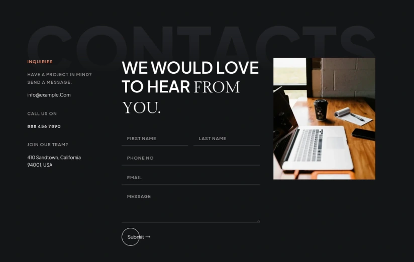 {"type":"@webflow/XscpData","payload":{"nodes":[{"_id":"81a0ea04-4207-b4d7-9ae8-b5bbb752ff84","type":"Section","tag":"section","classes":["78422069-232f-2bf0-1ec2-1a32048517b7"],"children":["a3a1c927-1195-716c-911e-9f3f80989bfd"],"data":{"tag":"section","devlink":{"runtimeProps":{},"slot":""},"displayName":"","attr":{"id":""},"xattr":[],"search":{"exclude":false},"visibility":{"conditions":[]},"grid":{"type":"section"}}},{"_id":"a3a1c927-1195-716c-911e-9f3f80989bfd","type":"Block","tag":"div","classes":["8e30c6b2-2856-04ac-5a02-e33924073af6"],"children":["086cd7a6-ec5a-dca5-bd0a-c986b272d94a"],"data":{"text":false,"tag":"div","devlink":{"runtimeProps":{},"slot":""},"displayName":"","attr":{"id":""},"xattr":[],"search":{"exclude":false},"visibility":{"conditions":[]}}},{"_id":"086cd7a6-ec5a-dca5-bd0a-c986b272d94a","type":"Block","tag":"div","classes":["316acd8a-eb63-af0a-2258-7bab92b74547"],"children":["ffd3e75f-625e-03e7-08ee-b5ab894a328f","7f392c0b-a382-4f19-b4cc-5c9c3a6cb26f"],"data":{"text":false,"tag":"div","devlink":{"runtimeProps":{},"slot":""},"displayName":"","attr":{"id":""},"xattr":[],"search":{"exclude":false},"visibility":{"conditions":[]}}},{"_id":"ffd3e75f-625e-03e7-08ee-b5ab894a328f","type":"Block","tag":"div","classes":["c603893f-8dd5-02e3-827f-3f71f627f821"],"children":["ac1d1d2f-ad0b-65aa-5b95-85b43c94601f","b760b683-b772-1b4b-069d-bdcacdd9295f","63fa11e2-fc94-0ec5-67f1-f9f03421dacd","91778947-3f2e-97c1-fe8e-b7d2ca89a2d6","c543ce7d-d856-4caa-c719-0c356bd2f581","9cb2d1a8-5b54-10b3-5357-0e8111d1771f","40a4ee7c-d691-ecb0-f093-2df4bb186318"],"data":{"text":false,"tag":"div","devlink":{"runtimeProps":{},"slot":""},"displayName":"","attr":{"id":""},"xattr":[],"search":{"exclude":false},"visibility":{"conditions":[]}}},{"_id":"ac1d1d2f-ad0b-65aa-5b95-85b43c94601f","type":"Block","tag":"div","classes":["8aecaccd-d005-2ac4-6a1c-1c172acdb782","ea2e634c-2108-08c0-0cca-418b72496a19","58555d1f-a7ef-4ff7-72ce-f87692492c9a"],"children":["7ce1da0d-8dd0-2191-7967-0d8c1b0d8f20"],"data":{"text":true,"tag":"div","devlink":{"runtimeProps":{},"slot":""},"displayName":"","attr":{"id":""},"xattr":[],"search":{"exclude":false},"visibility":{"conditions":[]}}},{"_id":"7ce1da0d-8dd0-2191-7967-0d8c1b0d8f20","text":true,"v":"Inquiries"},{"_id":"b760b683-b772-1b4b-069d-bdcacdd9295f","type":"Block","tag":"div","classes":["b39862eb-22a6-5e01-c64d-2949a165fdde"],"children":["6899deaa-a893-6ec0-e23b-fd31878d72c3"],"data":{"text":false,"tag":"div","devlink":{"runtimeProps":{},"slot":""},"displayName":"","attr":{"id":""},"xattr":[],"search":{"exclude":false},"visibility":{"conditions":[]}}},{"_id":"6899deaa-a893-6ec0-e23b-fd31878d72c3","type":"Block","tag":"div","classes":["8aecaccd-d005-2ac4-6a1c-1c172acdb782","930d4505-ff36-53f3-de81-b8342fe211bb","0fe18ca5-be91-0e0f-6302-d0a2b048ca5d"],"children":["bc856fe6-2855-9f0f-0d17-0149747a6add"],"data":{"text":true,"tag":"div","devlink":{"runtimeProps":{},"slot":""},"displayName":"","attr":{"id":""},"xattr":[],"search":{"exclude":false},"visibility":{"conditions":[]}}},{"_id":"bc856fe6-2855-9f0f-0d17-0149747a6add","text":true,"v":"Have a project in mind? Send a message."},{"_id":"63fa11e2-fc94-0ec5-67f1-f9f03421dacd","type":"Link","tag":"a","classes":["dbd771cd-cfcd-e8a9-c889-d85683eef108"],"children":["5ac519ed-7e4c-f82a-e7ea-ff540ff4ff78"],"data":{"button":false,"block":"inline","link":{"mode":"email","email":"info@example.com"},"eventIds":[],"attr":{"id":""},"devlink":{"runtimeProps":{},"slot":""},"displayName":"","xattr":[],"search":{"exclude":false},"visibility":{"conditions":[]}}},{"_id":"5ac519ed-7e4c-f82a-e7ea-ff540ff4ff78","type":"Block","tag":"div","classes":["604bae53-b4e5-c336-46dc-960782d0580e","71fd2a77-f2ae-7540-8c95-35e79fafa3d1"],"children":["53f48e20-a4c8-0825-0fcc-5b6a1d0aae77"],"data":{"text":true,"tag":"div","devlink":{"runtimeProps":{},"slot":""},"displayName":"","attr":{"id":""},"xattr":[],"search":{"exclude":false},"visibility":{"conditions":[]}}},{"_id":"53f48e20-a4c8-0825-0fcc-5b6a1d0aae77","text":true,"v":"info@example.Com"},{"_id":"91778947-3f2e-97c1-fe8e-b7d2ca89a2d6","type":"Block","tag":"div","classes":["8aecaccd-d005-2ac4-6a1c-1c172acdb782","930d4505-ff36-53f3-de81-b8342fe211bb","0fe18ca5-be91-0e0f-6302-d0a2b048ca5d"],"children":["877e906e-a6a0-def1-fede-0b1a7b64d68f"],"data":{"text":true,"tag":"div","devlink":{"runtimeProps":{},"slot":""},"displayName":"","attr":{"id":""},"xattr":[],"search":{"exclude":false},"visibility":{"conditions":[]}}},{"_id":"877e906e-a6a0-def1-fede-0b1a7b64d68f","text":true,"v":"Call Us on"},{"_id":"c543ce7d-d856-4caa-c719-0c356bd2f581","type":"Link","tag":"a","classes":["dbd771cd-cfcd-e8a9-c889-d85683eef108","ec8ba6cb-9dd2-abba-09fa-44e3f79a49c6"],"children":["6be08caf-3d40-7a7b-478d-d3bed3a608f5"],"data":{"button":false,"block":"inline","link":{"mode":"tel","tel":"888 456 7890"},"eventIds":[],"attr":{"id":""},"devlink":{"runtimeProps":{},"slot":""},"displayName":"","xattr":[],"search":{"exclude":false},"visibility":{"conditions":[]}}},{"_id":"6be08caf-3d40-7a7b-478d-d3bed3a608f5","type":"Block","tag":"div","classes":["8aecaccd-d005-2ac4-6a1c-1c172acdb782"],"children":["ec1f41fc-e95a-eb4b-d55c-7002a70bab32"],"data":{"text":true,"tag":"div","devlink":{"runtimeProps":{},"slot":""},"displayName":"","attr":{"id":""},"xattr":[],"search":{"exclude":false},"visibility":{"conditions":[]}}},{"_id":"ec1f41fc-e95a-eb4b-d55c-7002a70bab32","text":true,"v":"888 456 7890"},{"_id":"9cb2d1a8-5b54-10b3-5357-0e8111d1771f","type":"Block","tag":"div","classes":["8aecaccd-d005-2ac4-6a1c-1c172acdb782","930d4505-ff36-53f3-de81-b8342fe211bb","0fe18ca5-be91-0e0f-6302-d0a2b048ca5d"],"children":["4d22aff1-ba3c-6efc-825f-2e1e7c850d6e"],"data":{"text":true,"tag":"div","devlink":{"runtimeProps":{},"slot":""},"displayName":"","attr":{"id":""},"xattr":[],"search":{"exclude":false},"visibility":{"conditions":[]}}},{"_id":"4d22aff1-ba3c-6efc-825f-2e1e7c850d6e","text":true,"v":"join our team?"},{"_id":"40a4ee7c-d691-ecb0-f093-2df4bb186318