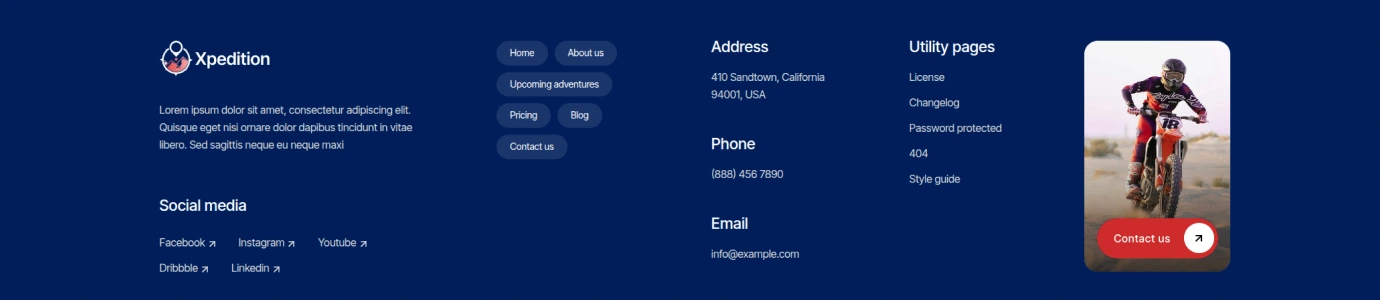 {"type":"@webflow/XscpData","payload":{"nodes":[{"_id":"a6644586-28b8-6dbf-4605-ddd5789b64b8","type":"Section","tag":"footer","classes":["48550e8a-10c7-be5f-f3b3-79c549b798aa"],"children":["0441e6fa-29eb-c064-a818-559c7a1c11ad"],"data":{"tag":"footer","devlink":{"runtimeProps":{},"slot":""},"displayName":"","attr":{"id":""},"xattr":[],"search":{"exclude":false},"visibility":{"conditions":[]},"grid":{"type":"section"}}},{"_id":"0441e6fa-29eb-c064-a818-559c7a1c11ad","type":"BlockContainer","tag":"div","classes":["48550e8a-10c7-be5f-f3b3-79c549b7988a"],"children":["7ea792ec-632b-6b41-fe93-79567e27f743","754bca5f-77ce-ad82-3912-b9562e126974"],"data":{"tag":"div","devlink":{"runtimeProps":{},"slot":""},"displayName":"","attr":{"id":""},"xattr":[],"search":{"exclude":false},"visibility":{"conditions":[]},"grid":{"type":"container"}}},{"_id":"7ea792ec-632b-6b41-fe93-79567e27f743","type":"HFlex","tag":"div","classes":["48550e8a-10c7-be5f-f3b3-79c549b79850"],"children":["072304cd-0700-fdef-4336-b266e70e409a","4f83f83f-b39a-a17f-a65b-111ddfe89a86","ab0112d9-404c-315b-19fa-c13ec09e69a7","04b917d5-7e23-0673-f56c-a84a6d332b39","b3386e71-e144-f8cf-5d13-69f24eddab46"],"data":{"tag":"div","devlink":{"runtimeProps":{},"slot":""},"displayName":"","attr":{"id":""},"xattr":[],"search":{"exclude":false},"visibility":{"conditions":[]}}},{"_id":"072304cd-0700-fdef-4336-b266e70e409a","type":"VFlex","tag":"div","classes":["48550e8a-10c7-be5f-f3b3-79c549b79866"],"children":["f54d0de7-0381-56a9-ebe5-1638e8cd53ca","2c7e9994-cd9e-4c2a-16e3-60baad64b1d9","50a67f4f-fed2-20b5-2eff-52fc6015f472"],"data":{"tag":"div","devlink":{"runtimeProps":{},"slot":""},"displayName":"","attr":{"id":""},"xattr":[],"search":{"exclude":false},"visibility":{"conditions":[]},"style":{"base":{"medium":{"noPseudo":{"gridColumnStart":"span 3","gridColumnEnd":"span 3","gridRowStart":"span 1","gridRowEnd":"span 1"}},"small":{"noPseudo":{"gridColumnStart":"span 2","gridColumnEnd":"span 2"}}}}}},{"_id":"f54d0de7-0381-56a9-ebe5-1638e8cd53ca","type":"Link","tag":"a","classes":["48550e8a-10c7-be5f-f3b3-79c549b797f8"],"children":["743c3fa9-dcc1-5de0-8b12-c672a805747b"],"data":{"button":false,"block":"inline","link":{"mode":"external","href":"#"},"eventIds":[],"attr":{"id":"","href":"#"},"devlink":{"runtimeProps":{},"slot":""},"displayName":"","xattr":[],"search":{"exclude":false},"visibility":{"conditions":[]}}},{"_id":"743c3fa9-dcc1-5de0-8b12-c672a805747b","type":"Image","tag":"img","classes":[],"children":[],"data":{"img":{"id":"68c90948277d504a90933d56"},"srcsetDisabled":false,"attr":{"width":"166","height":"53","alt":"__wf_reserved_inherit","src":"https://cdn.prod.website-files.com/68c90948277d504a90933cdd/68c90948277d504a90933d56_Xpedition%20Logo.avif","loading":"lazy","id":""},"sizes":[{"max":166,"size":"100vw"},{"max":10000,"size":"166px"}],"devlink":{"runtimeProps":{},"slot":""},"displayName":"","xattr":[],"search":{"exclude":false},"visibility":{"conditions":[]}}},{"_id":"2c7e9994-cd9e-4c2a-16e3-60baad64b1d9","type":"Block","tag":"div","classes":["48550e8a-10c7-be5f-f3b3-79c549b7980f"],"children":["c7b3fc16-12e6-2ef8-cb1b-fa974a345683"],"data":{"text":false,"tag":"div","devlink":{"runtimeProps":{},"slot":""},"displayName":"","attr":{"id":""},"xattr":[],"search":{"exclude":false},"visibility":{"conditions":[]},"style":{"base":{"medium":{"noPseudo":{"order":9999}}}}}},{"_id":"c7b3fc16-12e6-2ef8-cb1b-fa974a345683","type":"Paragraph","tag":"p","classes":["48550e8a-10c7-be5f-f3b3-79c549b798b2","48550e8a-10c7-be5f-f3b3-79c549b7990a"],"children":["79f9a329-6b7a-4e32-ad1d-71de8744a6be"],"data":{"devlink":{"runtimeProps":{},"slot":""},"displayName":"","attr":{"id":""},"xattr":[],"search":{"exclude":false},"visibility":{"conditions":[]}}},{"_id":"79f9a329-6b7a-4e32-ad1d-71de8744a6be","text":true,"v":"Lorem ipsum dolor sit amet, consectetur adipiscing elit. Quisque eget nisi ornare dolor dapibus tincidunt in vitae libero. Sed sagittis neque eu neque maxi"},{"_id":"50a67f4f-fed2-20b5-2eff-52fc6015f472","type":"VFlex","tag":"div","classes":["48550e8a-10c7-be5f-f3b3-79c549b7989a"],"children":["681a055c-4752-9615-ab53-1bd31a22d6c9","2895a10f-8d13-56bd-95e9-b3659e6919b5"],"data":{"tag":"div","devlink":{"runtimeProps":{},"slot":""},"displayName":"","attr":{"id":""},"xattr":[],"search":{"exclude":false},"visibility":{"conditions":[]},"style":{"base":{"medium":{"noPseudo":{"gridColumnStart":"span 1","gridColumnEnd":"span 1","gridRowStart":"span 2","gridRowEnd":"span 2"}},"small":{"noPseudo":{"order":9999}}}}}},{"_id":"681a055c-4752-9615-ab53-1bd31a22d6c9","type":"Block","tag":"div","classes":["48550e8a-10c7-be5f-f3b3-79c549b798b4","48550e8a-10c7-be5f-f3b3-79c549b798fa"],"children":["91fbeca4-7079-c144-e0d6-6d41849a2396"],"data":{"text":true,"tag":"div","devlink":{"runtimeProps":{},"slot":""},"displayName":"","attr":{"id":""},"xattr":[],"search":{"exclude":false},"visibility":{"conditions":[]}}},{"_id":"91fbeca4-7079-c144-e0d6-6d41849a2396","text":true,"v":"Social media"},{"_id":"2895a10f-8d13-56bd-95e9-b3659e6919b5","type":"HFlex","tag":"div","classes":["48550e8a-10c7-be5f-f3b3-79c549b7987e"],"children":["f2556988-2740-73e4-f7a8-88723fe888ca","db21697a-3174-c28a-e827-42a39fcafdf6","1d7a384c-8620-234f-b3ee-4b36d760c5e5","692b4b42-d098-eabf-a19e-9c3a8fcab3e3","3582cae9-5bad-6507-0349-c1e47544c495"],"data":{"tag":"div","devlink":{"runtimeProps":{},"slot":""},"displayName":"","attr":{"id":""},"xattr":[],"search":{"exclude":false},"visibility":{"conditions":[]}}},{"_id":"f2556988-2740-73e4-f7a8-88723fe888ca","type":"Link","tag":"a","classes":["48550e8a-10c7-be5f-f3b3-79c549b79801"],"children":["438c5e29-2bb7-d055-ba7a-f10ba6c080fc","02ded454-34f1-0cfc-471c-ddca37c28154"],"data":{"button":false,"block":"inline","link":{"mode":"external","url":"https://www.facebook.com/","target":"_blank"},"eventIds":[],"attr":{"id":""},"devlink":{"runtimeProps":{},"slot":""},"displayName":"","xattr":[],"search":{"exclude":false},"visibility":{"conditions":[]}}},{"_id":"438c5e29-2bb