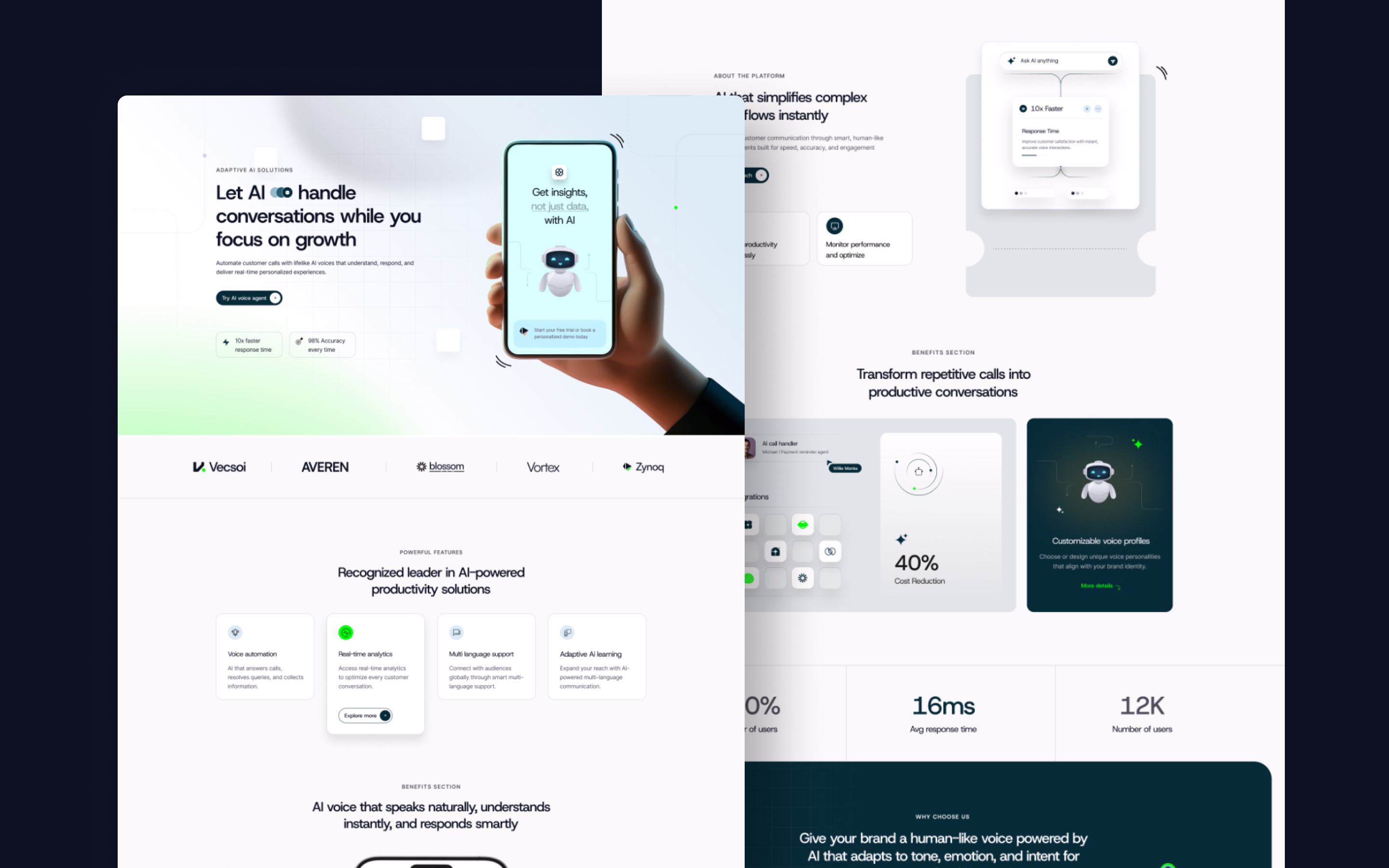 Nuonix is a Webflow template specifically engineered for an AI start up or SaaS company focused on AI voice agent technology. It features a high-impact, professional design to showcase natural conversation capabilities and scalable AI solution.
