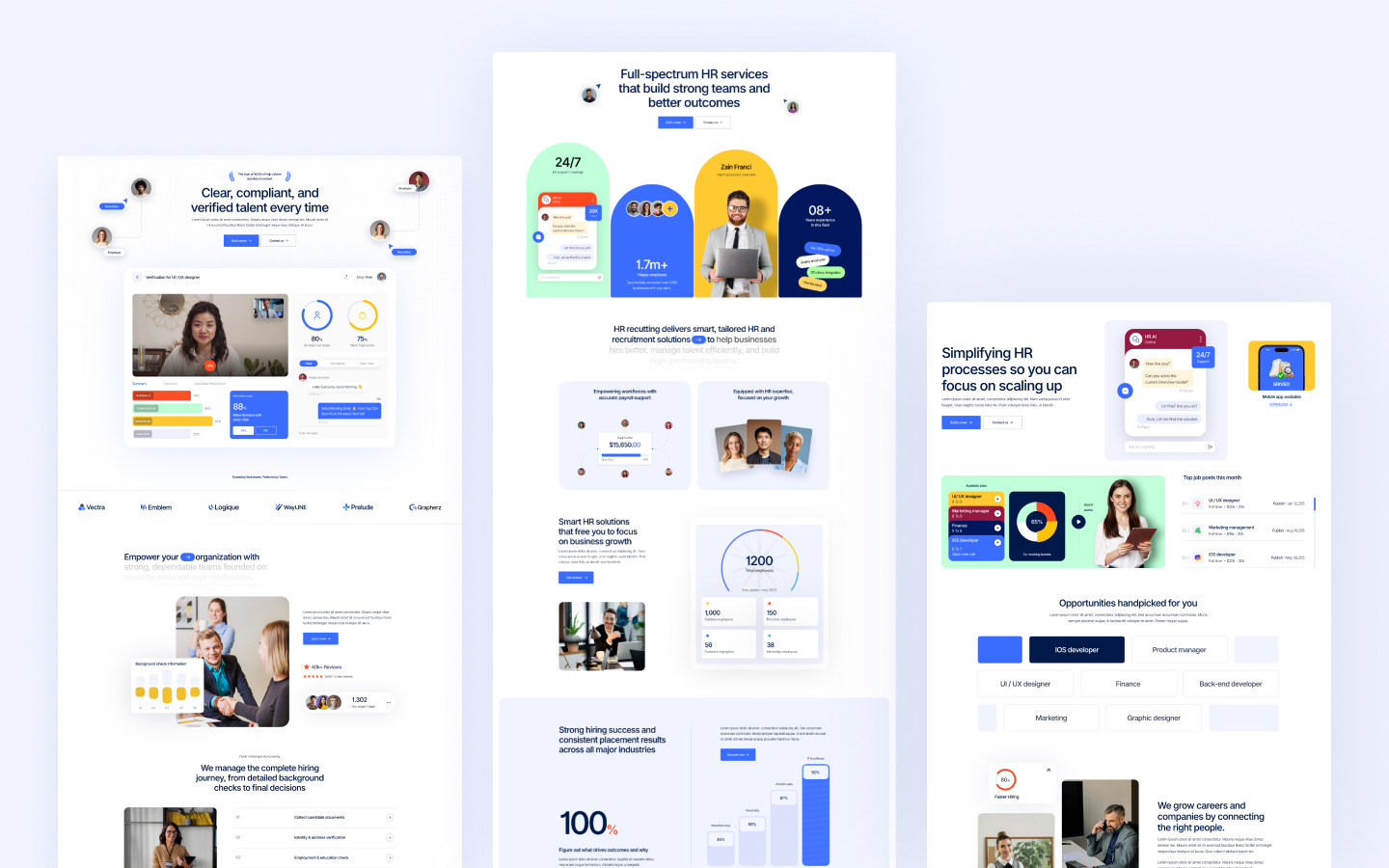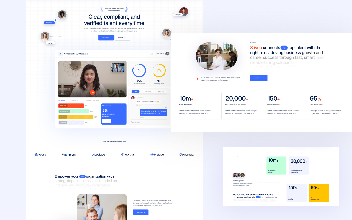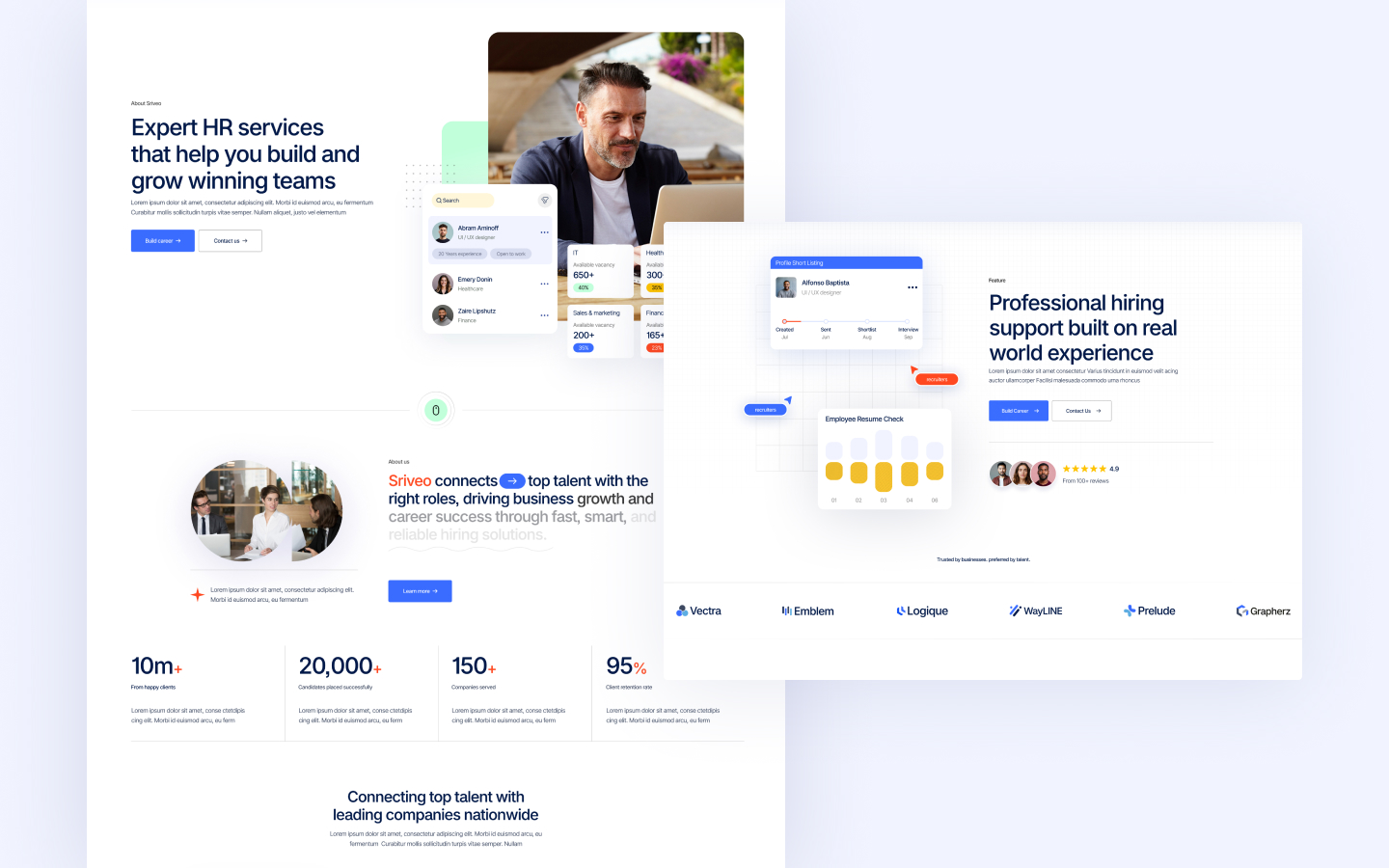 Sriveo is a professional Webflow template designed for HR and recruitment agencies. This recruitment agency Webflow template is a strategic solution for launching a high-quality online presence with pre-optimized sections and a variety of demos.
