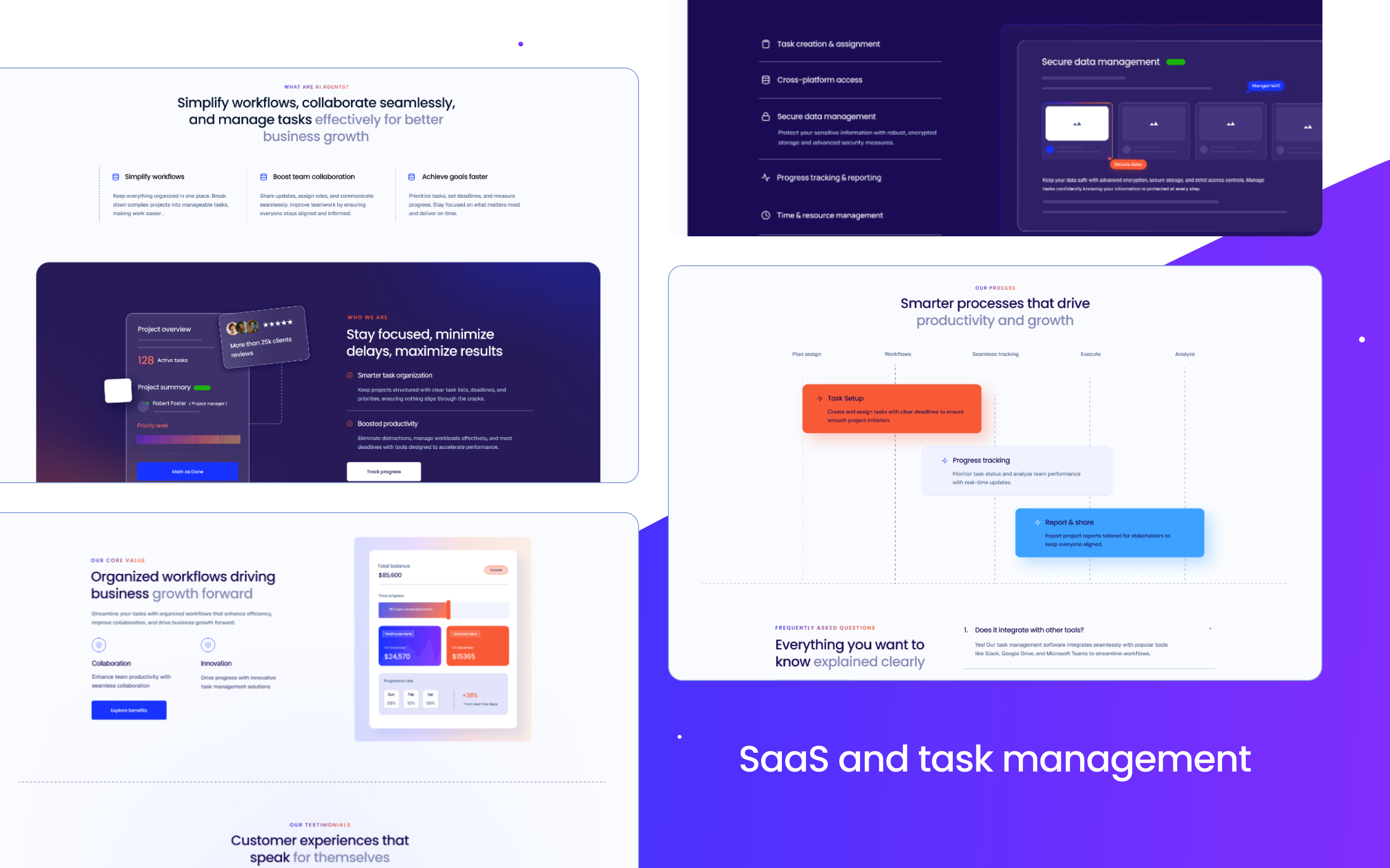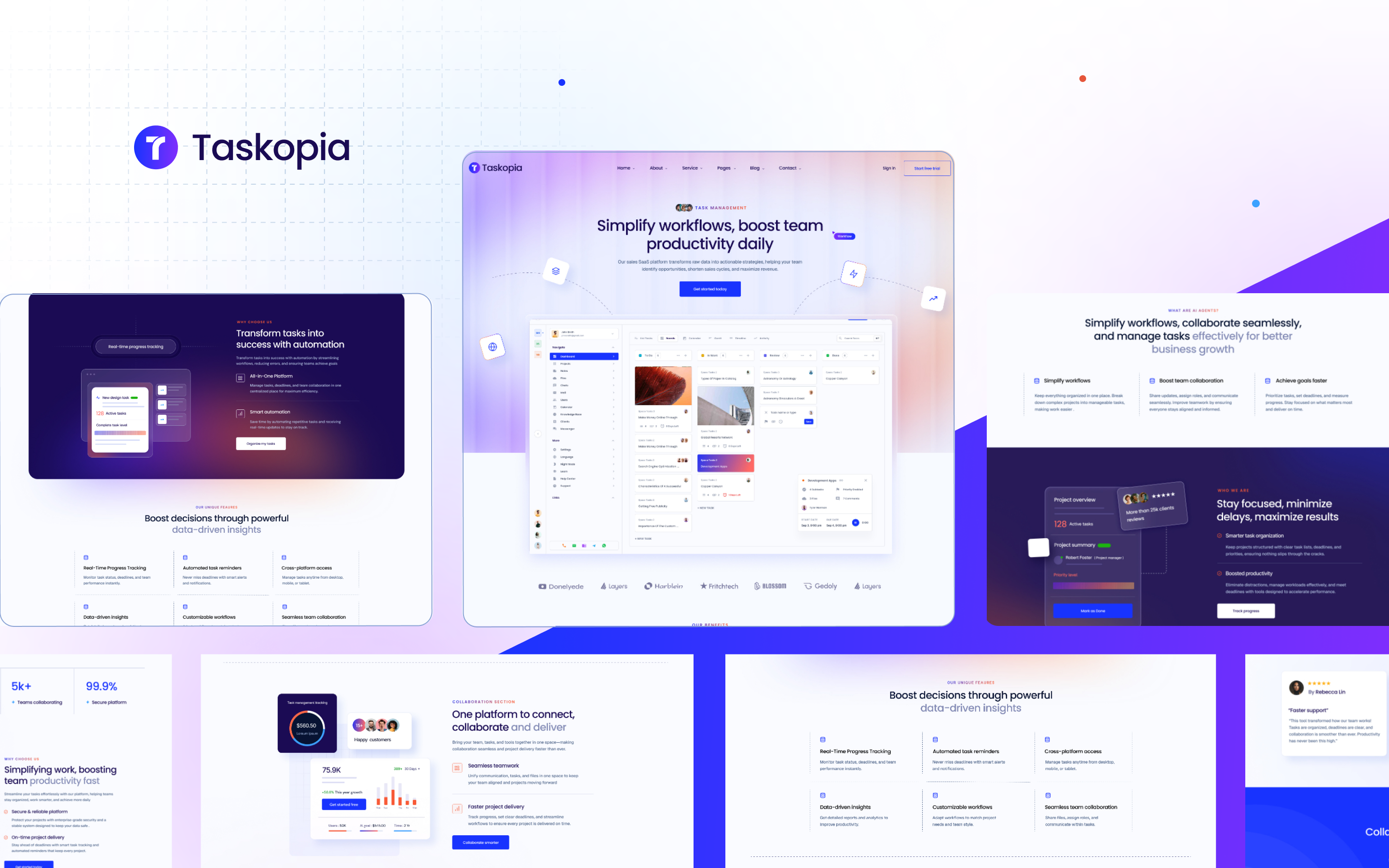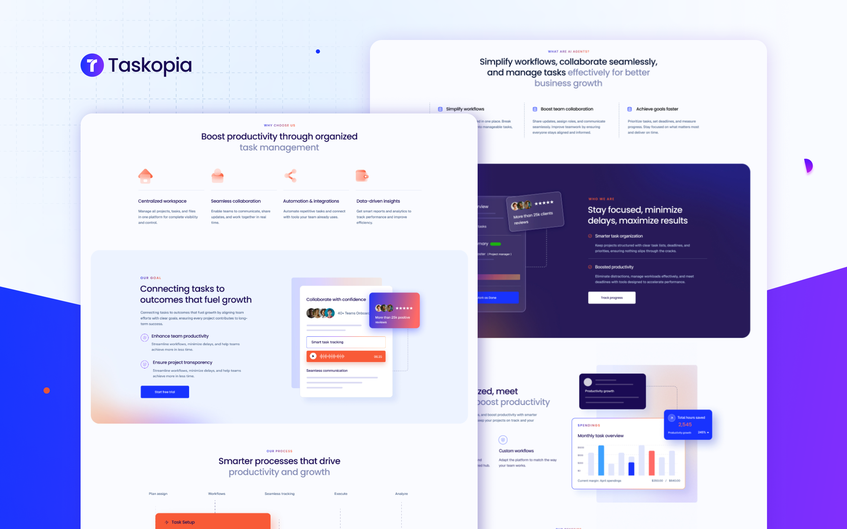 Taskopia is a SaaS Webflow template for task automation platforms and workflow management. It features 3 homepages, specialized Service and Pricing pages, plus full CMS support for team and project content.