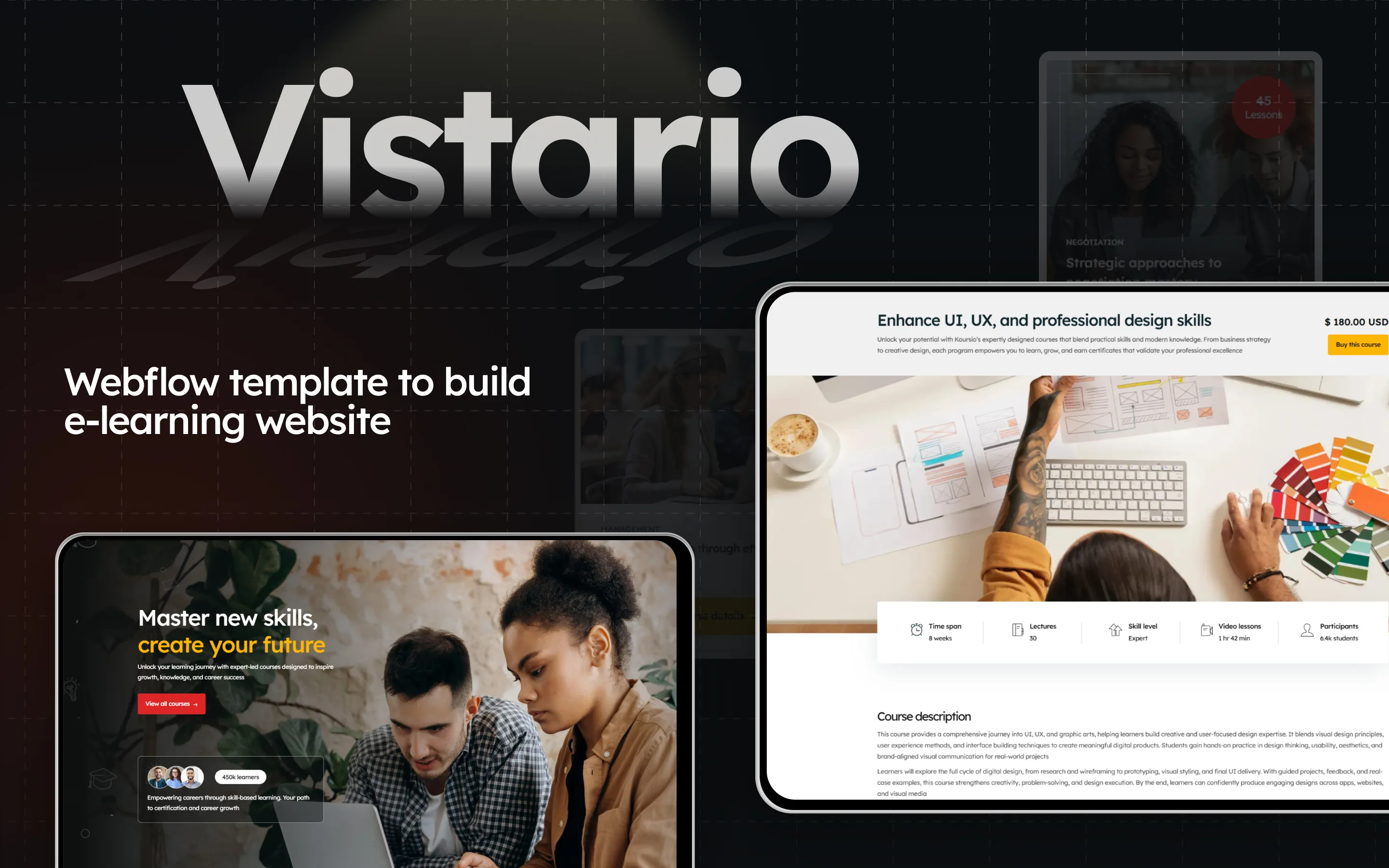 Vistario is the premier e-learning Webflow template for building a comprehensive online learning platform. Launch authoritative websites to market and sell expert-led online courses for digital education.